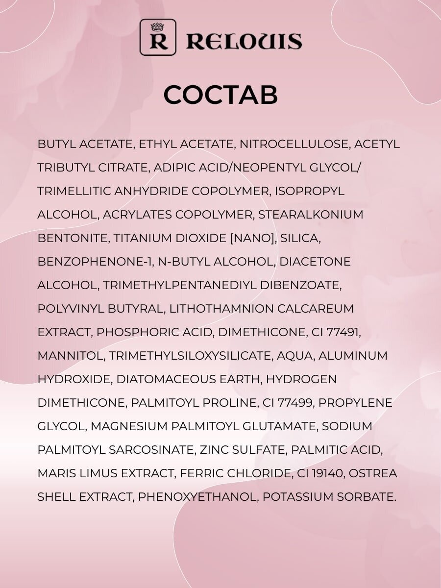 | Состав | butyl acetate, ethyl acetate, nitrocellulose, acetyl tributyl citrate, adipic acid/ neopentyl glycol/ trimellitic anhydride copolymer, isopropyl alcohol, acrylates copolymer, stearalkonium bentonite, styrene/acrylates copolymer, ci 77891 (nano), benzophenone-1, trimethylpentanediyl dibenzoate, algae, polyvinyl butyral, ci 77491, dimethicone, trimethylsiloxysilicate, aqua, palmitoyl proline, propylene glycol, sodium palmitoyl sarcosinate, magnesium palmitoyl glutamate, palmitic acid, ostrea shell extract, ferric chloride, maris limus, ci 19140 |
