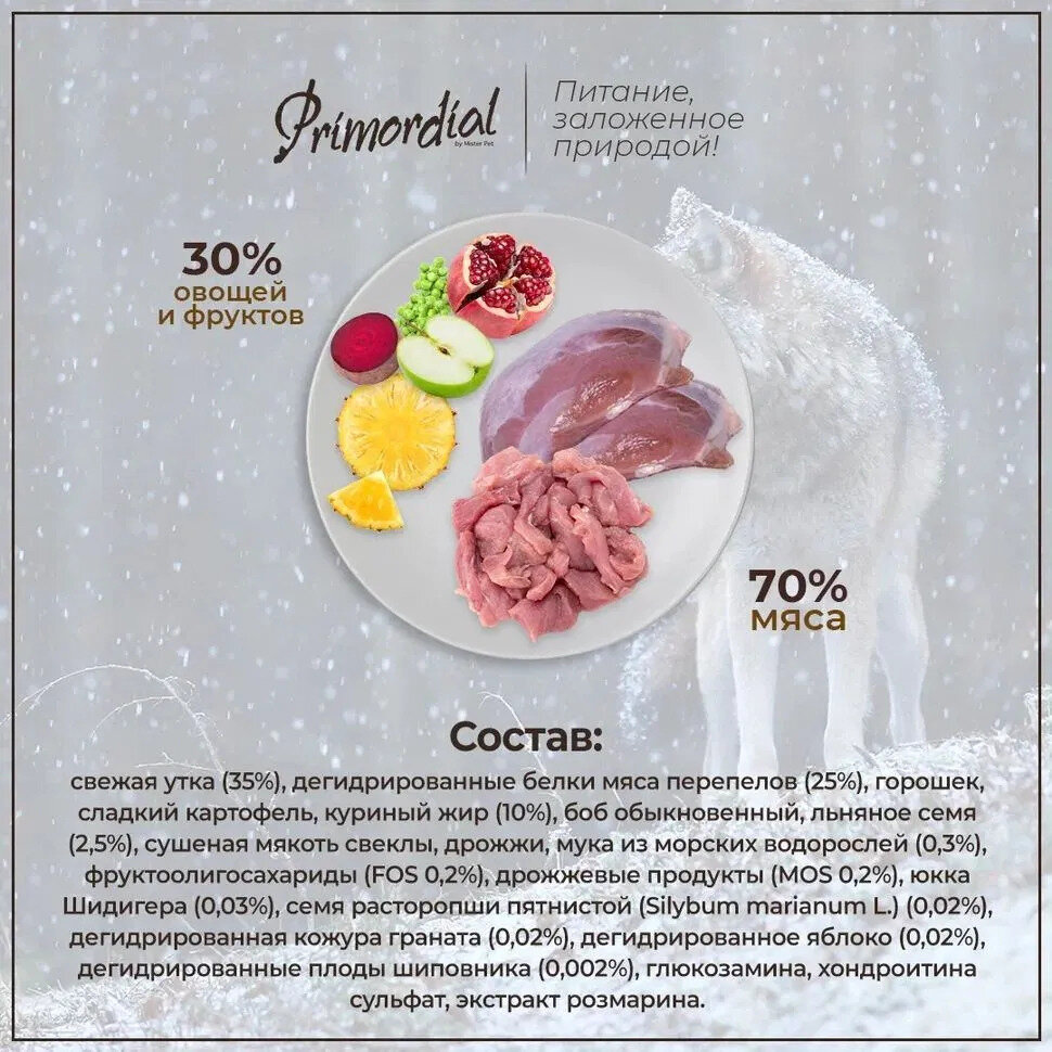 Корм PRIMORDIAL MINI ADULT сухой для собак мелких пород, беззерновой, перепелка утка.Беззерновой корм класса холистик. Специально отобранные виды мяса и рыбы поддерживают низкий гликемический индекс, гарантируют высокую аппетитность и перевариемость корма.Состав: свежее утиное мясо (35%), дегидрированные белки мяса перепелов (25%), горошек, сладкий картофель, куриный жир (10%), боб обыкновенный, льняное семя (2,5%), сушеная мякоть свеклы, дрожжи, мука из морских водорослей (0,3%), фруктоолигосахариды (FOS 0,2%), дрожжевые продукты (MOS 0,2%), юкка Шидигера (0,03%), семя расторопши пятнистой (Silybum marianum L.) (0,02%), дегидрированная кожура граната (0,02%), дегидрированное яблоко (0,02%), дегидрированные плоды шиповника (0,002%), глюкозамина, хондроитина сульфат, экстракт розмарина.Пищевые добавки на кг: 3a672a Витамин A 21000 UI, 3a671 Витамин D3 1400 UI, 3a700 Витамин E 180 мг, 3b405 медь 15 мг, 3b101 железо 30 мг, 3b502 марганец 60 мг, 3b605 цинк 68 мг, 3b201 йод 3,7 мг, 3b801 селен 0,16 мг.Аналитические компоненты: влага 8%, сырой белок 29%, сырая клетчатка 2,4%, сырые жиры 20%, сырая зола 8,6%.Консистенция продукта: сухой гранулированный корм. Рекомендуемый дневной рацион:Peso del cane Вес собаки 2 кг 4 кг 5 кг 6 кг 7 кг 8 кг 9 кг 10 кг 12 кгRazione giornaliera Дневная доза 40 г 70 г 85 г 95 г 105 г 120 г 130 г 140 г 160Дневные дозы указаны приблизительно и могут варьироваться в зависимости от физической активности животного и от его пищевых потребностей.Инструкции по использованию: Хранить в сухом и прохладном месте. Корм можно давать как в сухом, так и в смоченном виде. Всегда оставляйте для собаки свежую воду. Рекомендуется использовать до истечения срока годности. Новый продукт необходимо вводить постепенно. Номер партии и срок годности указаны на мешке.