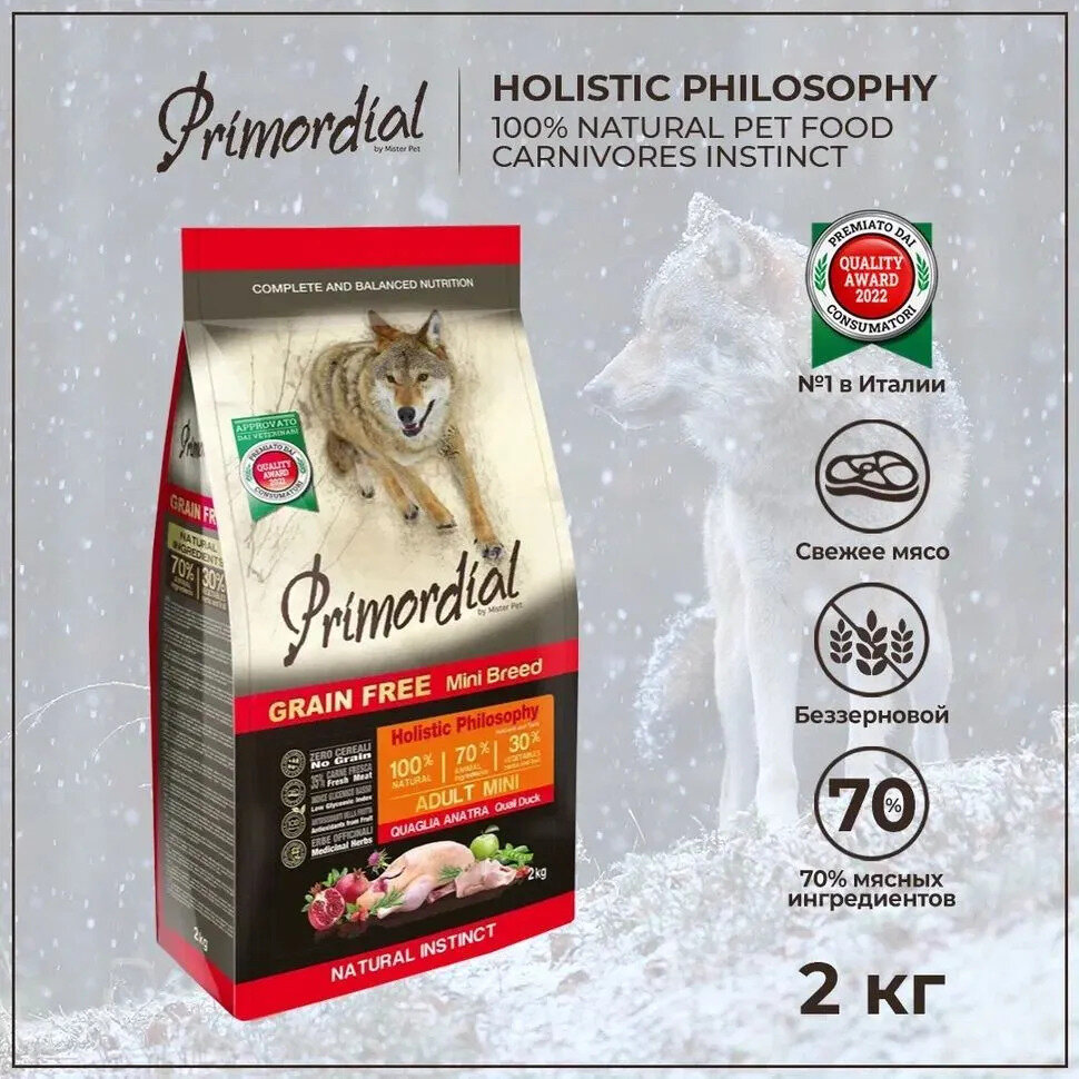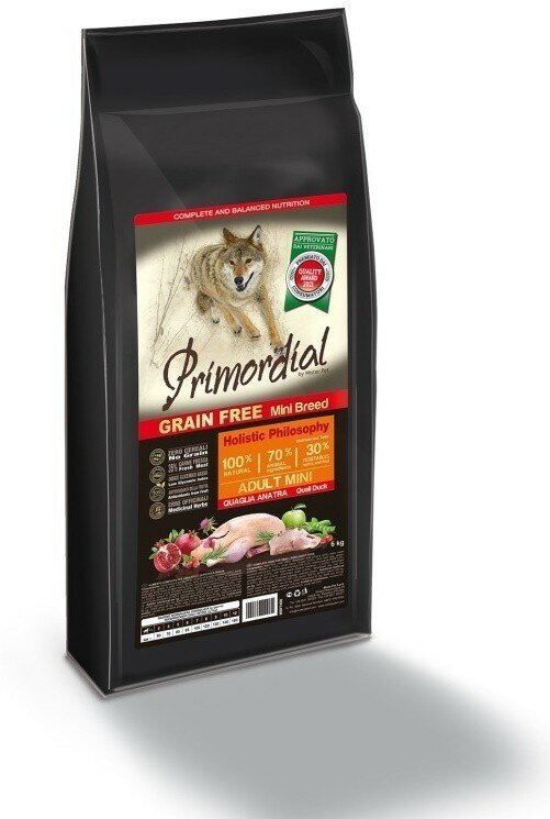 Корм сухой для собак мелких пород беззерновой перепелка и утка Mini Adult Primordial 6кг MISTER PET (2413808)