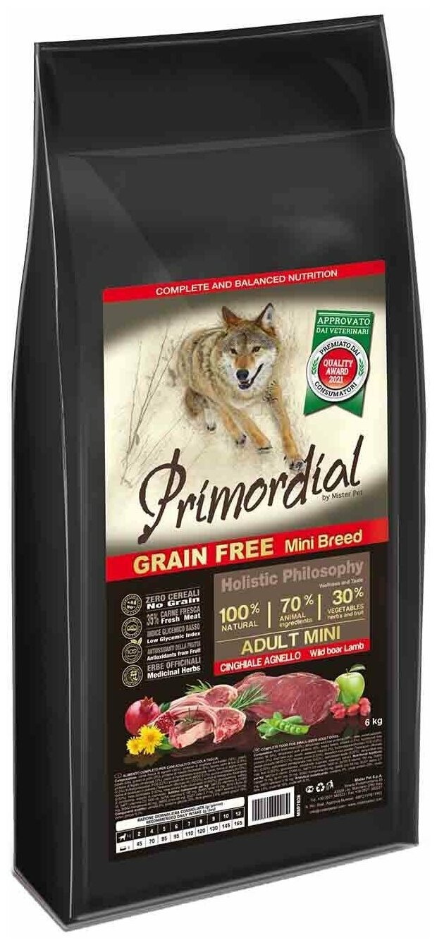 Корм сухой для собак мелких пород беззерновой кабан и ягненок Mini Adult Primordial 2кг MISTER PET (2413808)