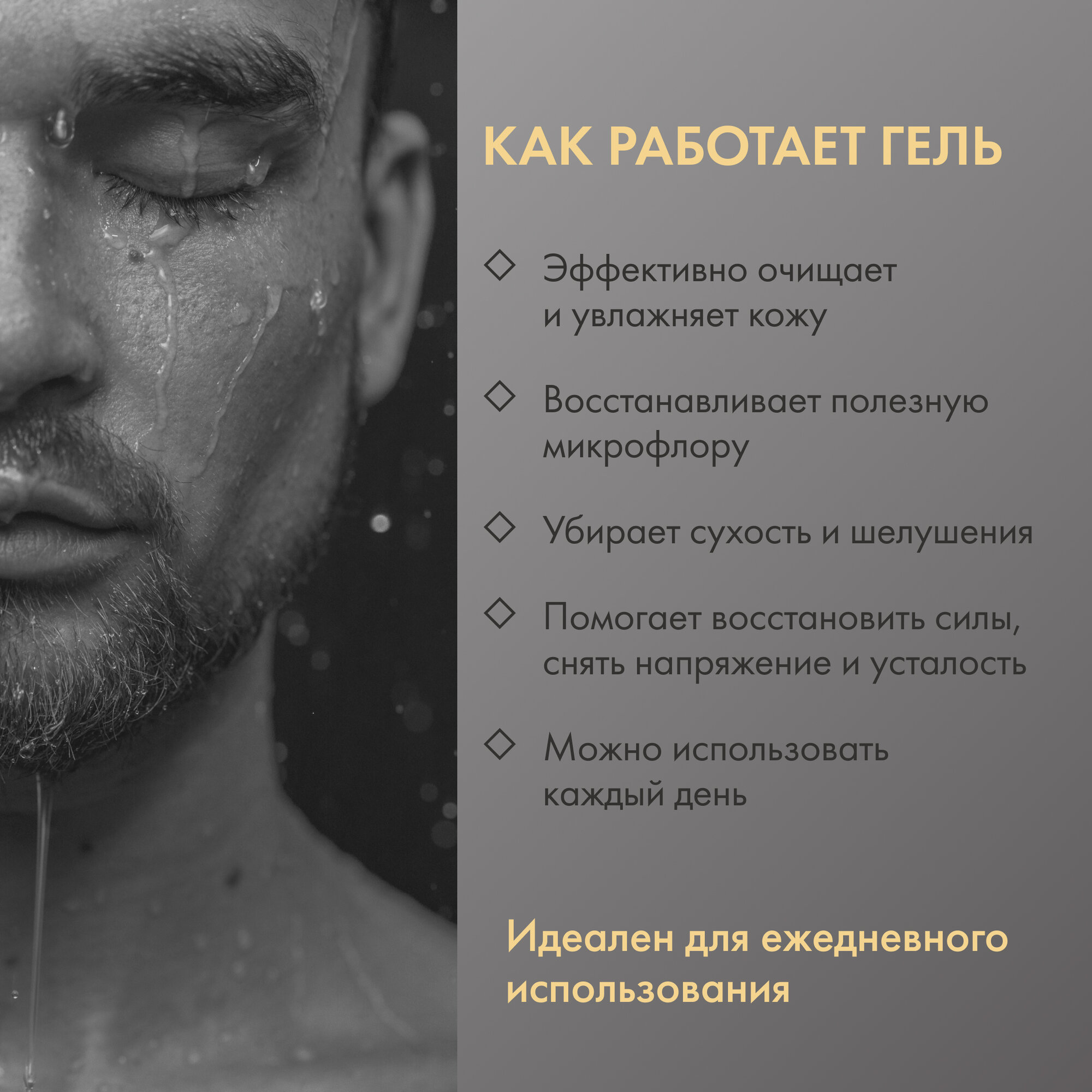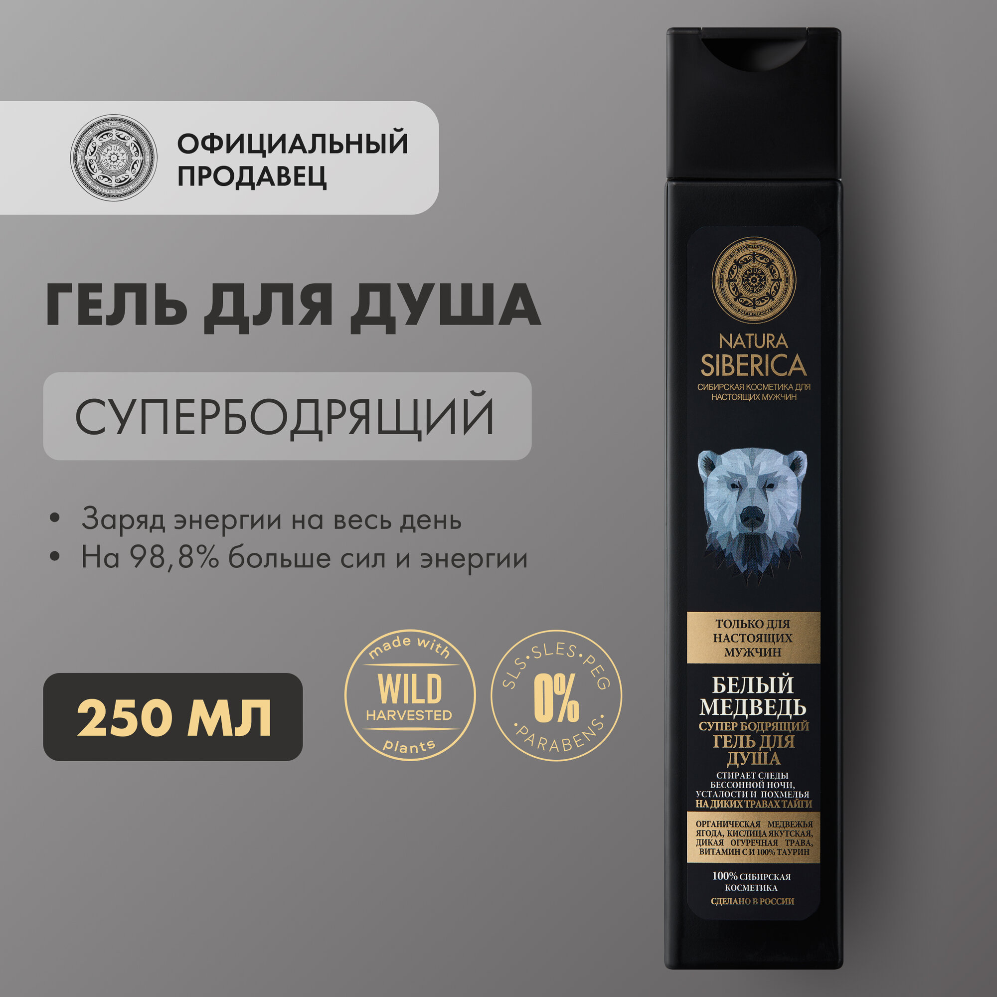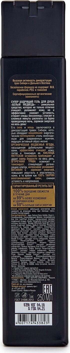 Его сила и мощь, заключается в дикорастущий травах Сибири, которые обладают мощнейшим энергетическим потенциалом, столь необходимым для современных мужчин, ведущих активный образ жизни. Медвежья ягода, насыщенная дубильными веществами, эффективно очищает кожу, питая и тонизируя ее. Кислица якутская мгновенно пробуждает и дарит заряд бодрости на весь день. Огуречная трава освежает и тонизирует, стимулирует регенерацию клеток, интенсивно увлажняет. Витамин С заряжает энергией, повышает упругость и эластичность кожи, в то время как 100% таурин восстанавливает силы, снимая усталость и напряжение.
