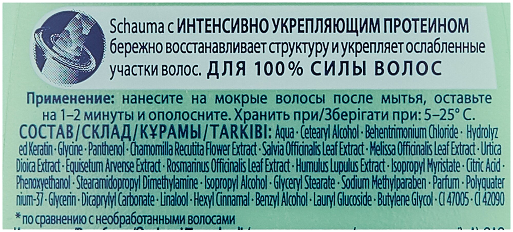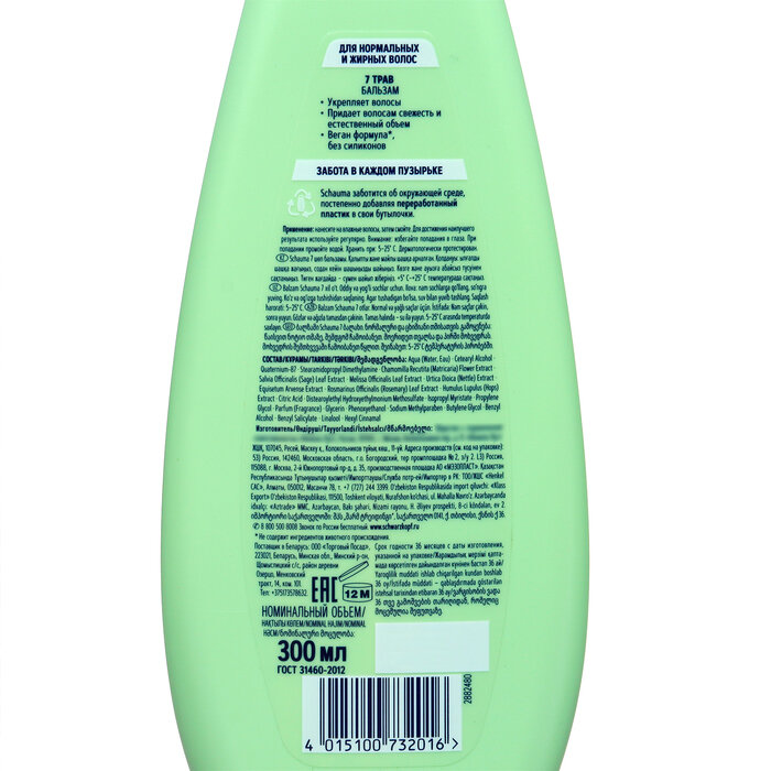 Бальзам для волос Schauma 2017330/2022855/1909856/1882913 с экстрактом трав питает, укрепляет и улучшает структуру жирных и нормальных волос. Активные компоненты воздействуют на сальные железы и нормализуют выделение подкожного жира.