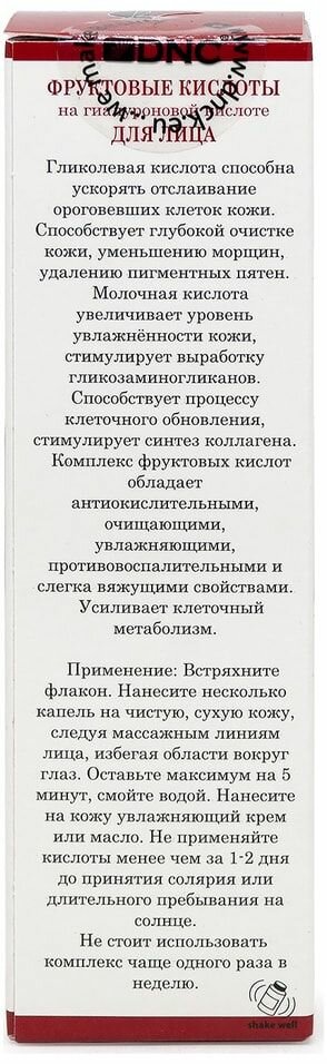 | Состав | citrus aurantium distillate (нероли гидролат), lactic acid (молочная кислота), glycolic acid (гликолевая кислота), sodium hyaluronate (гиалуроновая кислота), leuconostoc/radish root ferment filtrate (леуконосток/фермент редиски), tartaric acid (винная кислота), malic acid (яблочная кислота). |