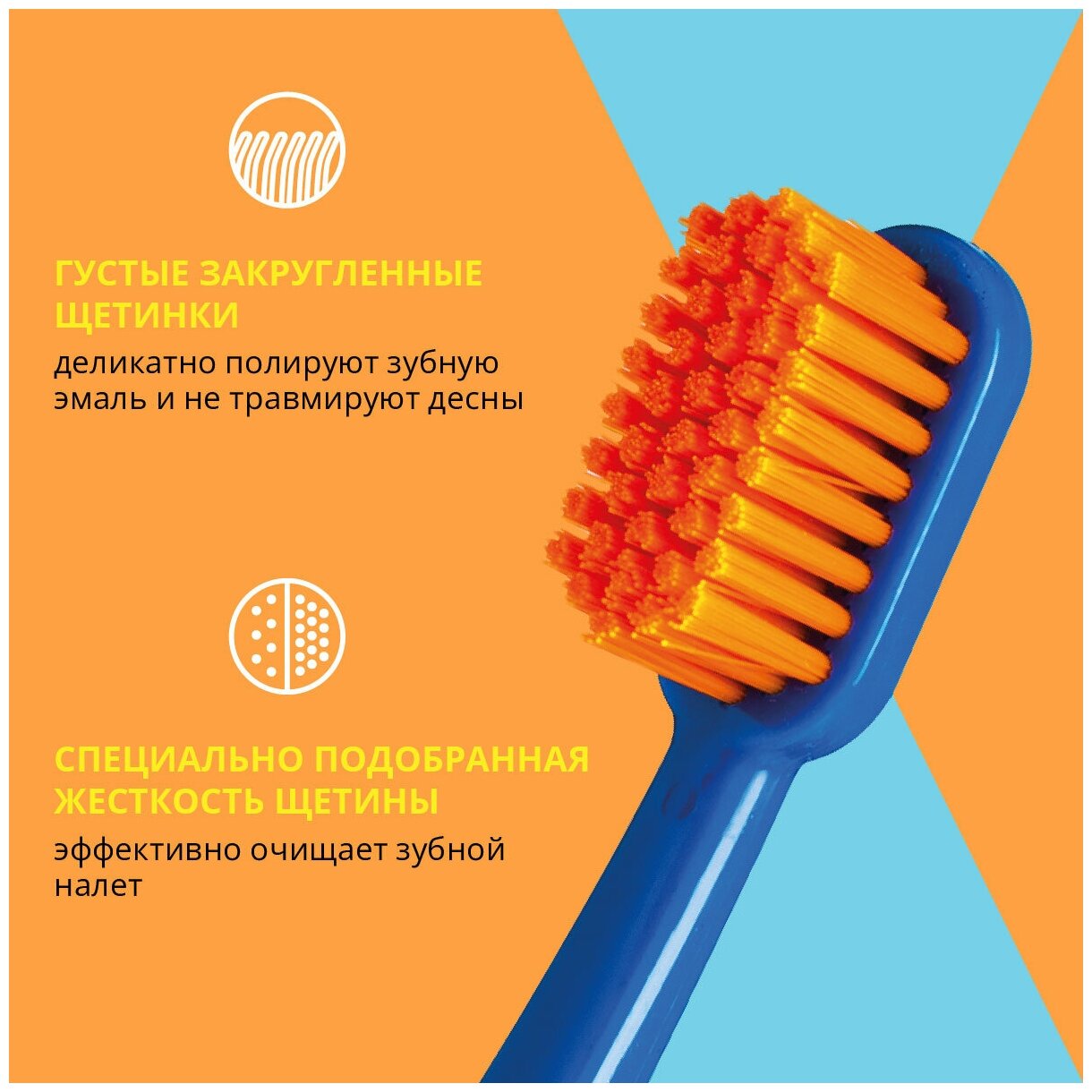 Компактная чистящая поверхность обеспечивает тщательное и бережное очищение внешних, внутренних и жевательных участков зубного ряда. Густые, закругленные щетинки деликатно полируют зубную эмаль и не травмируют десны. Специально подобранная жесткость щетины эффективно очищает никотиновый и пигментированный налет. Эргономичная ручка круглой формы позволяет соблюдать правильную технику чистки зубов, в том числе в пришеечной зоне и труднодоступных местах.