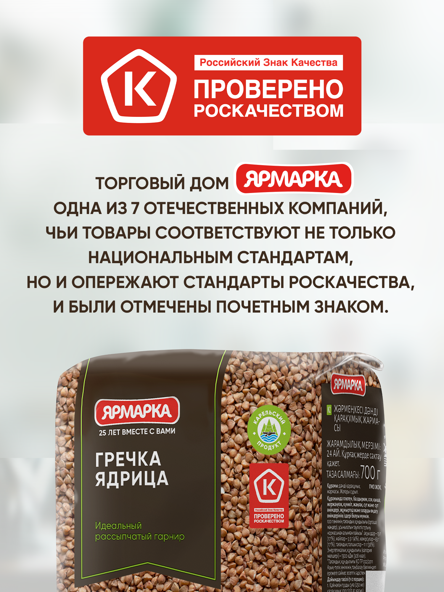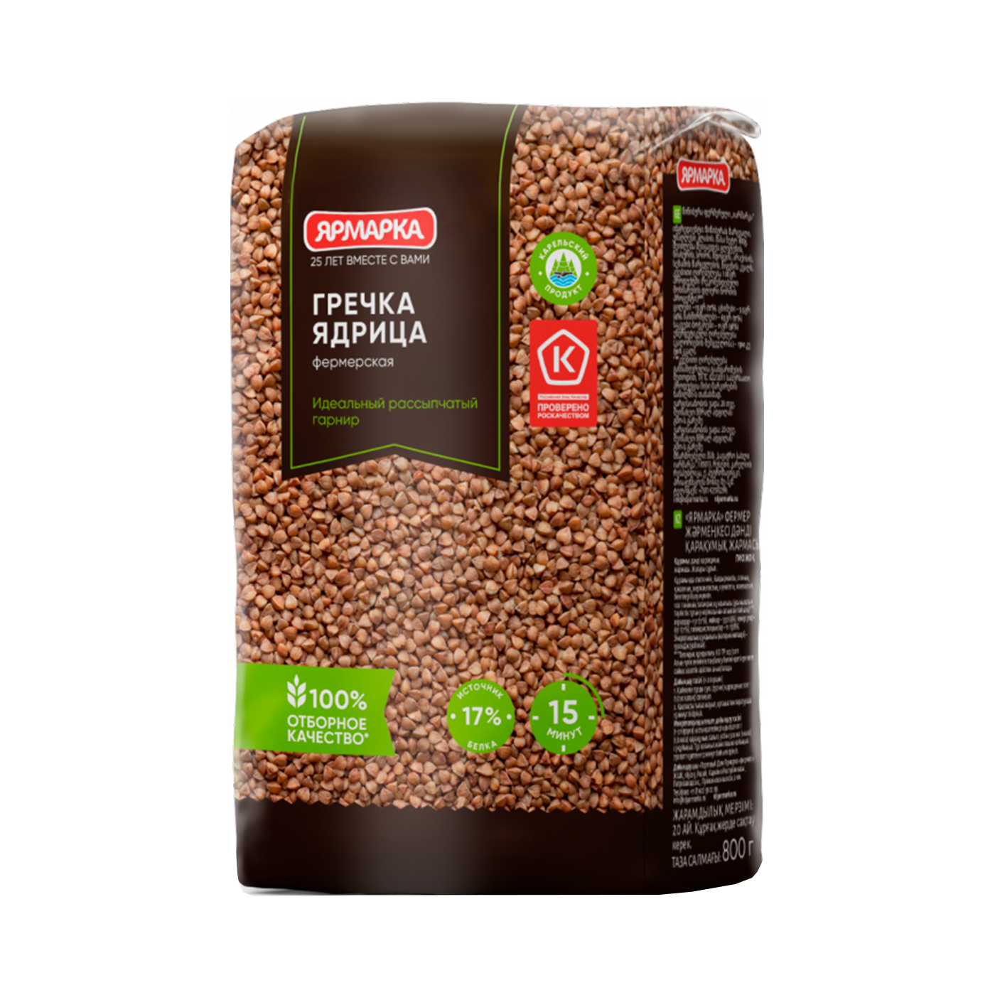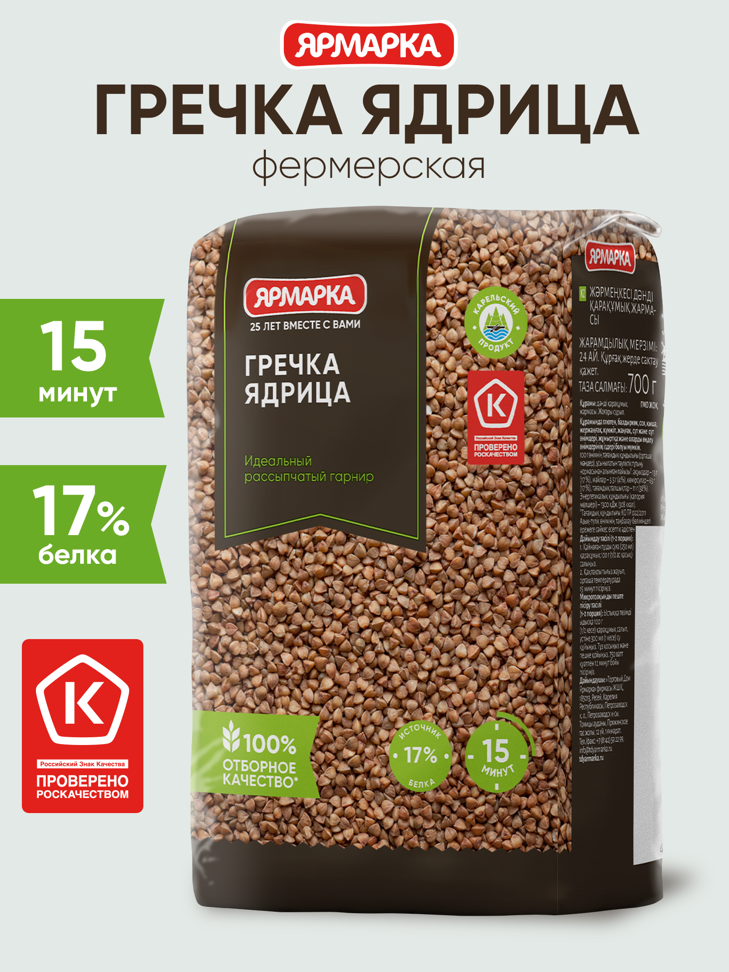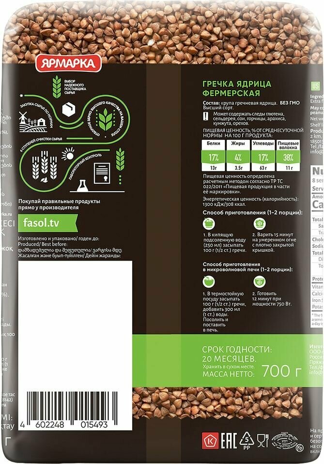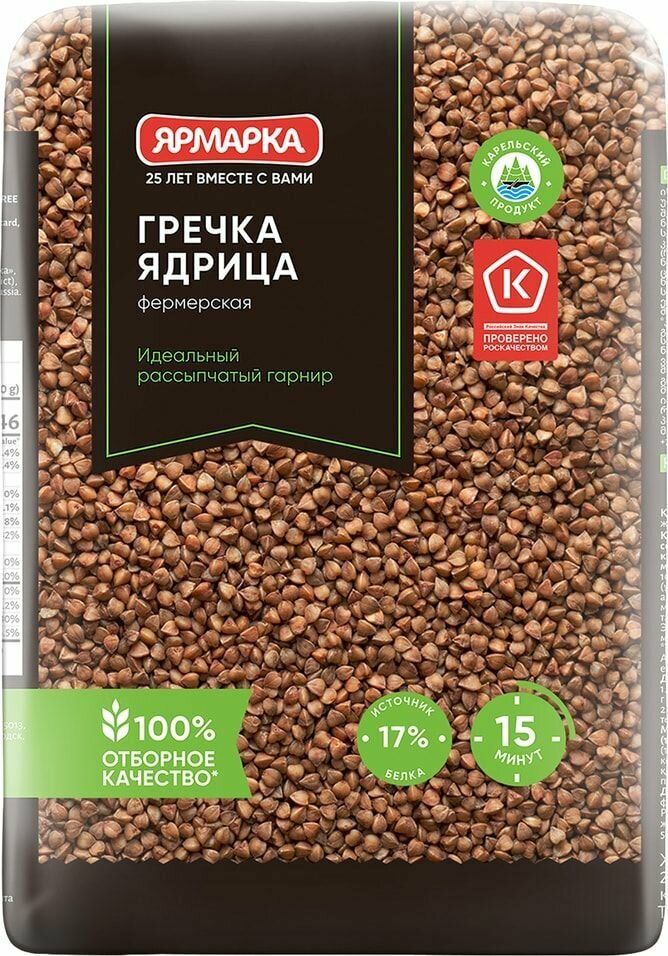 Гречка ядрица "Ярмарка" - высшего качества. Имеет насыщенный коричневый цвет. Учёные считают, что гречневая крупа родом из Индии и Непала. Именно там стали выращивать этот злак четыре тысячи лет назад. В Россию она попала из Греции, поэтому и дали ей такое название. На производстве зерно гречихи подвергают тепловой обработке паром, очищают от оболочки. Специальное оборудование Sortex позволяет сортировать зернышки по размеру, удаляя продел и сор. Поэтому греча ядрица от "Ярмарки" славится хорошим качеством. Полезные свойства гречневой крупы давно известны, это одна из самых полезных круп. Она богата белком, витаминами группы В, железом и фосфором, цинком и магнием. В ней есть жиры, но особые, полиненасыщенные, а также пищевые волокна. Они помогают организму бороться с лишним весом, снижают уровень холестерина. Поэтому гречневая диета так популярна среди желающих похудеть. Употребление гречи рекомендуется при тяжелых физических нагрузках, при нарушении обмена веществ, для укрепления сердечно-сосудистой системы, для профилактики атеросклероза. Питательная ценность гречневой крупы такова, что её сравнивают с мясом и бобовыми. В ней много "медленных" углеводов, которые легко усваиваются организмом и дают ощущение сытости надолго. Гречу рекомендуют включать в рацион диабетикам и гипертоникам. Она полезна всем без исключения.
