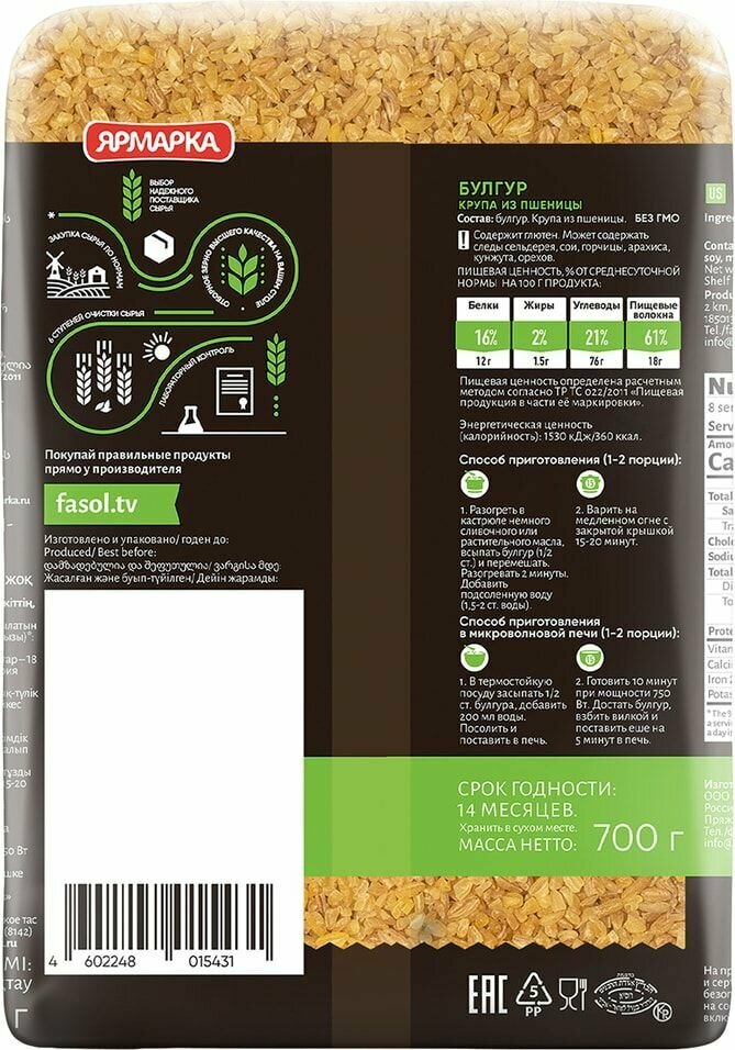 | Состав | Булгур. Крупа из пшеницы. Содержит глютен. Может содержать следы сельдерея, сои, горчицы, арахиса, кунжута, орехов. |