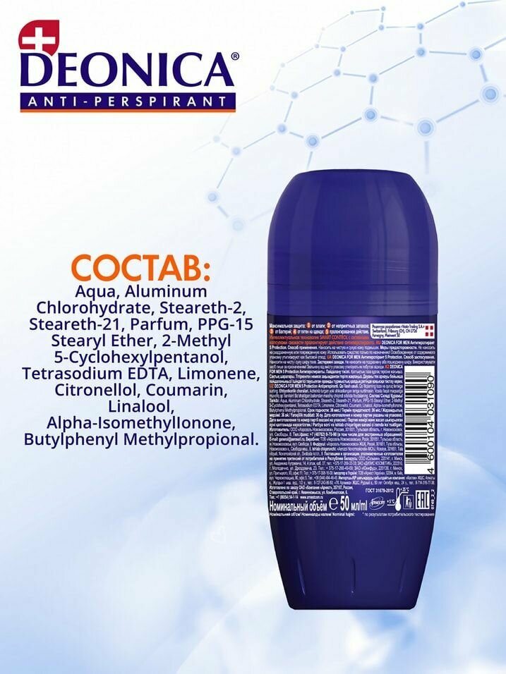 | Химический состав | Aqua, Aluminum Chlorohydrate, Steareth-2, Steareth-21, PPG-15 Stearyl Ether, 2- Methyl 5-Cyclohexylpentanol, Parfum, Tetrasodium EDTA, Limonene, Citronellol, Linalool, Alpha-Isomethyl-Ionone. |