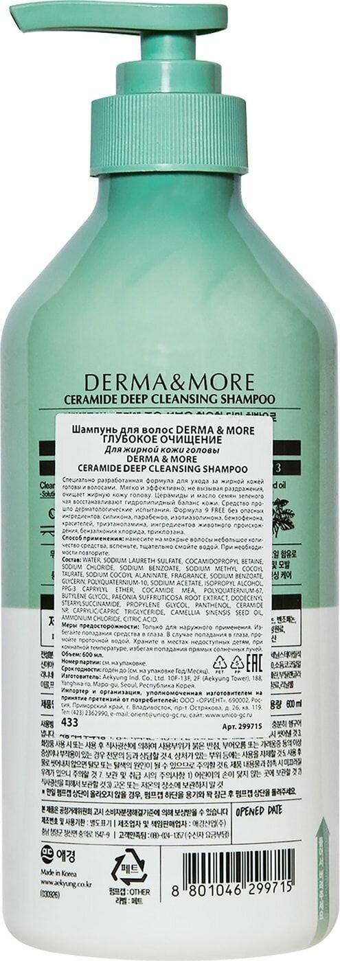 Шампунь для волос Derma & More глубокое очищение 600мл Aekyung Industrial