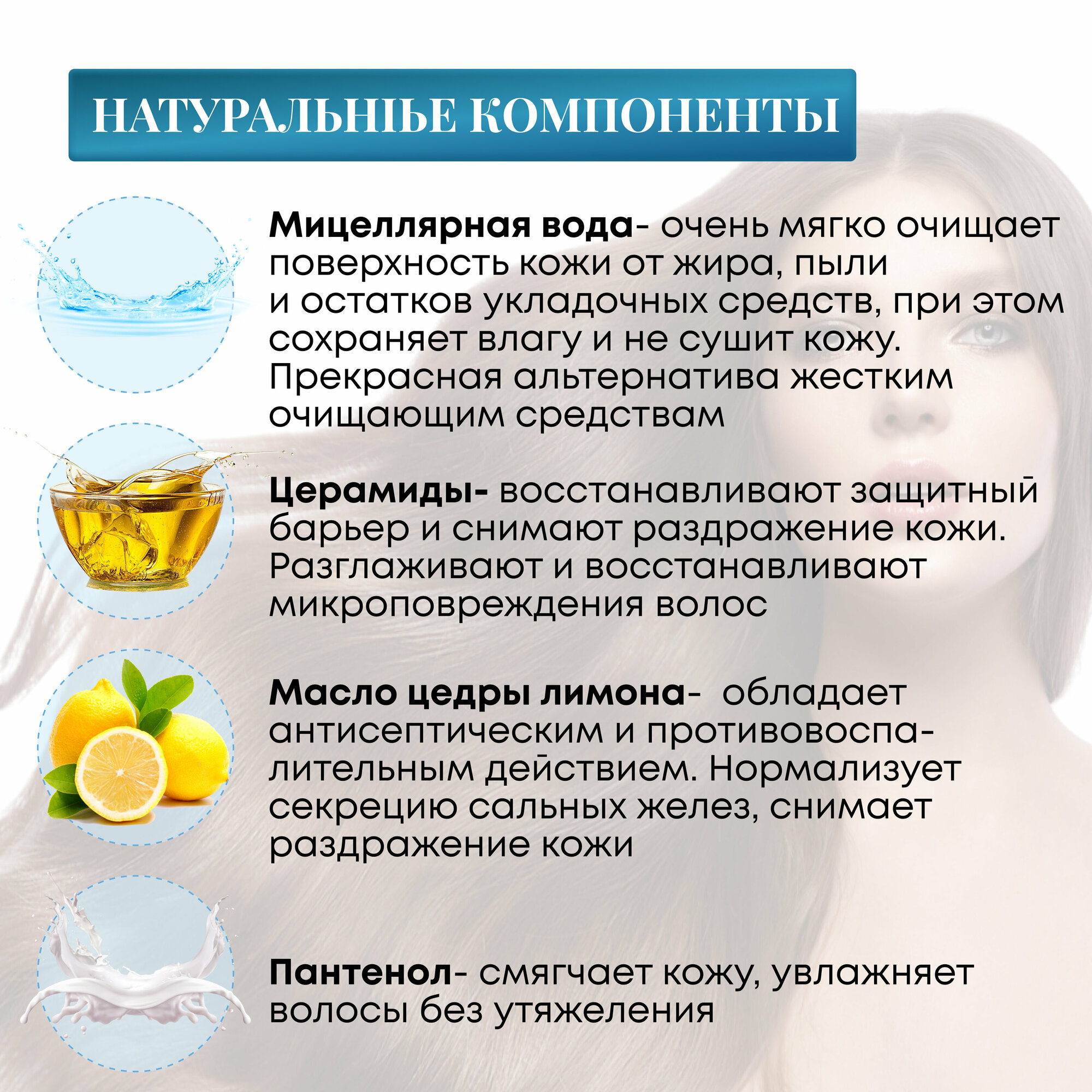 Специально разработанная формула с мицеллярной основой для мягкого и эффективного очищения кожи головы и волос. Натуральные церамиды и масло цедры лимона питают, увлажняют и оздоравливают кожу головы и волосы. На 96% состоит из ингредиентов растительного происхождения. Формула 8 Free без опасных ингредиентов: силикона, парабенов, бензофенона, красителей, изотиазолинона, триклозана, триэтаноламина, бензалкония хлорида. Является гипоаллергенным средством с мягкой формулой. Подходит для ежедневного применения.