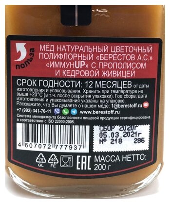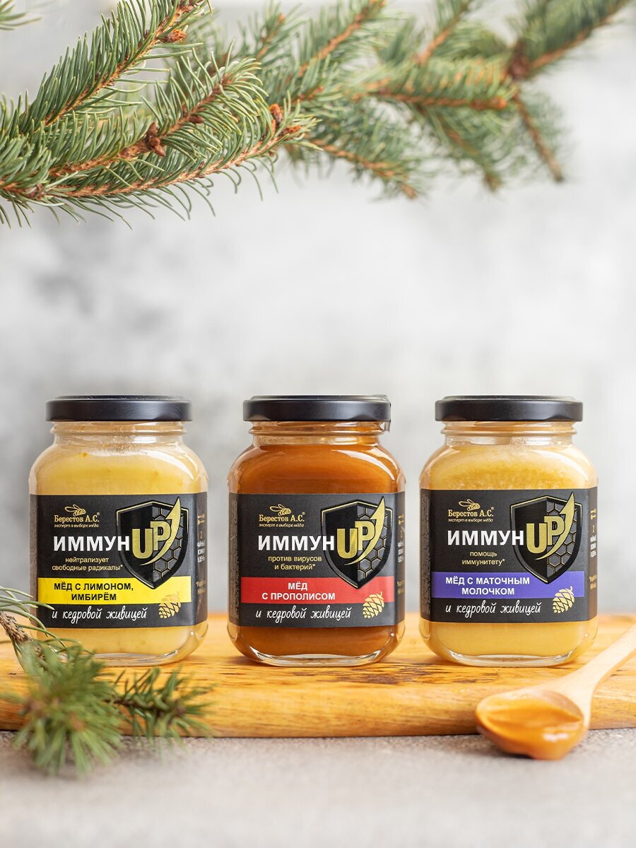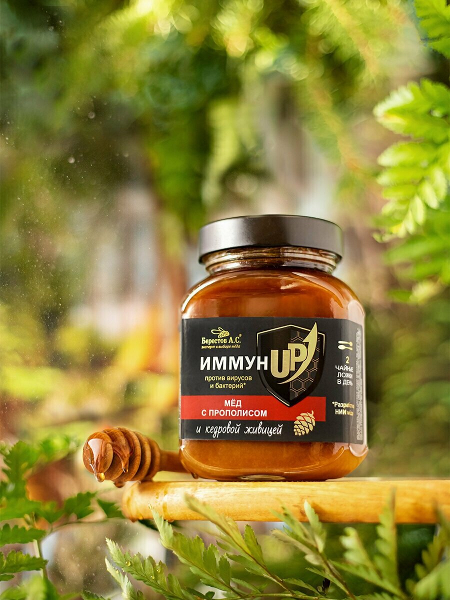 Линейка "ИммунUP" разработана НИИ мёда и пчелопродуктов по заказу компании "Берестов А.С." не имеет аналогов. Кедровая живица, в составе которой много смоляных кислот, обладает разносторонней физиологической активностью, сильным противовоспалительным, противомикробным, противовирусным, ранозаживляющим действием, стимулирует иммунологические процессы. Прополис содержит флавоноиды, которые нейтрализуют свободные радикалы, вызывающие окислительное повреждение клеток организма. Благодаря своему антибактериальному действию прополис является "натуральным антибиотиком". Благодаря включению этих мощных природных компонентов, мёд "ИммунUP" с прополисом и кедровой живицей способствует очищению сосудов, помогает предотвратить развитие болезней верхних дыхательных путей и укрепить иммунитет!
