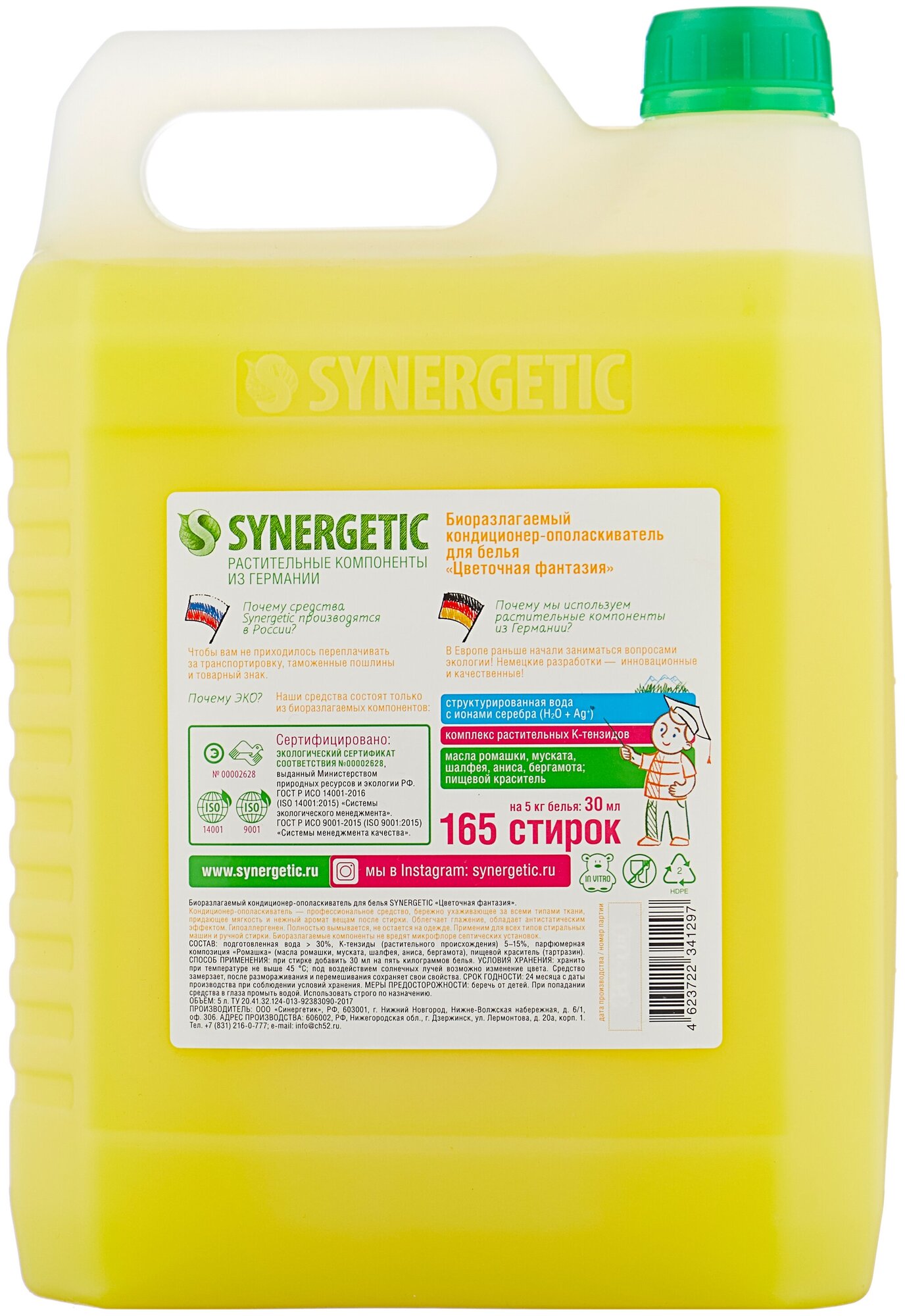 Сейчас объясним, к чему это мы. Средство для стирки обеспечивает чистоту, но именно кондиционер незаметно повышает качество жизни каждый день: смягчает ткань, придает аромат свежести, облегчает глажку и дает антистатический эффект. Вспомните ощетинившиеся махровые полотенца, которые стоят колом после высыхания — огрубевшая ткань хуже впитывает влагу и раздражает кожу. Кондиционер SYNERGETIC справляется со своей задачей даже в жесткой воде и заботится о вашем хорошем настроении каждый день.