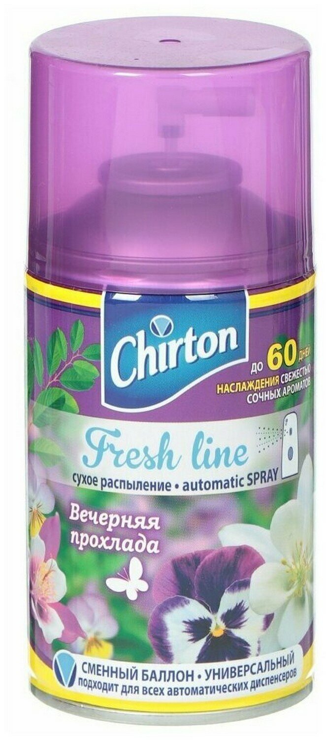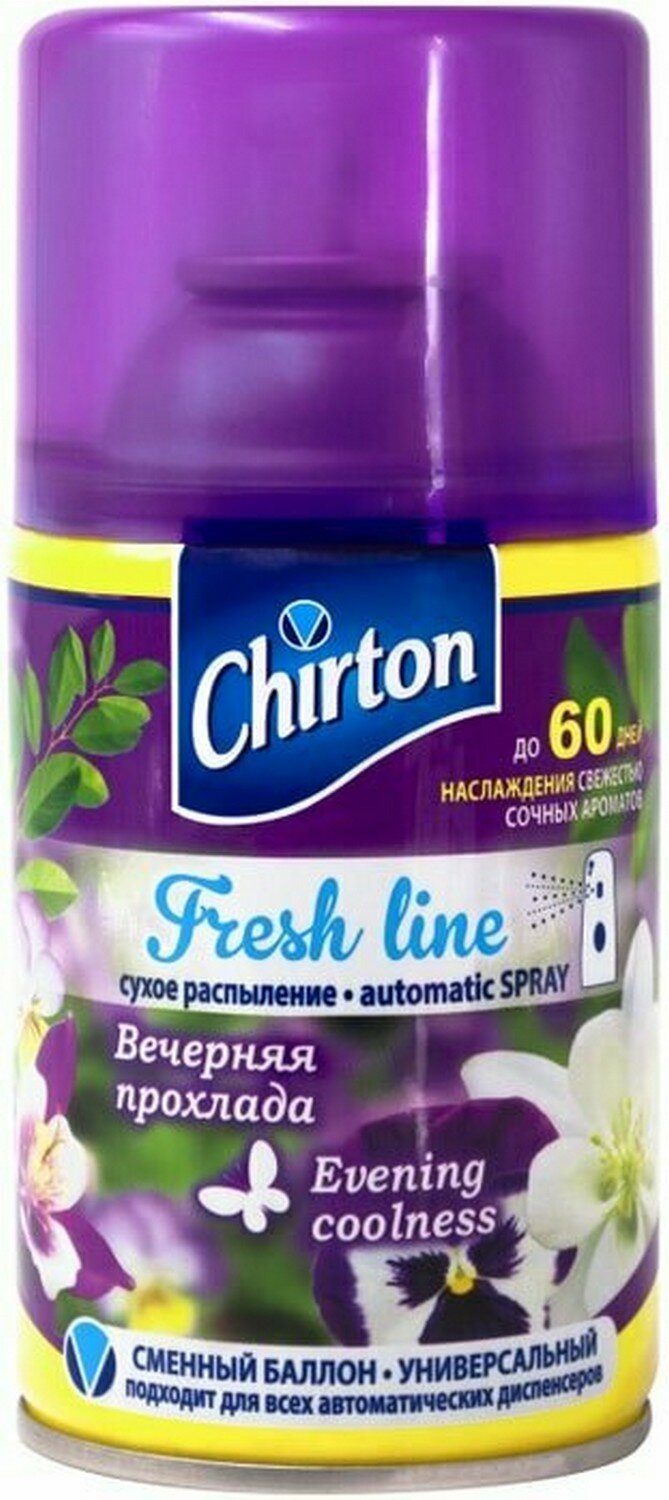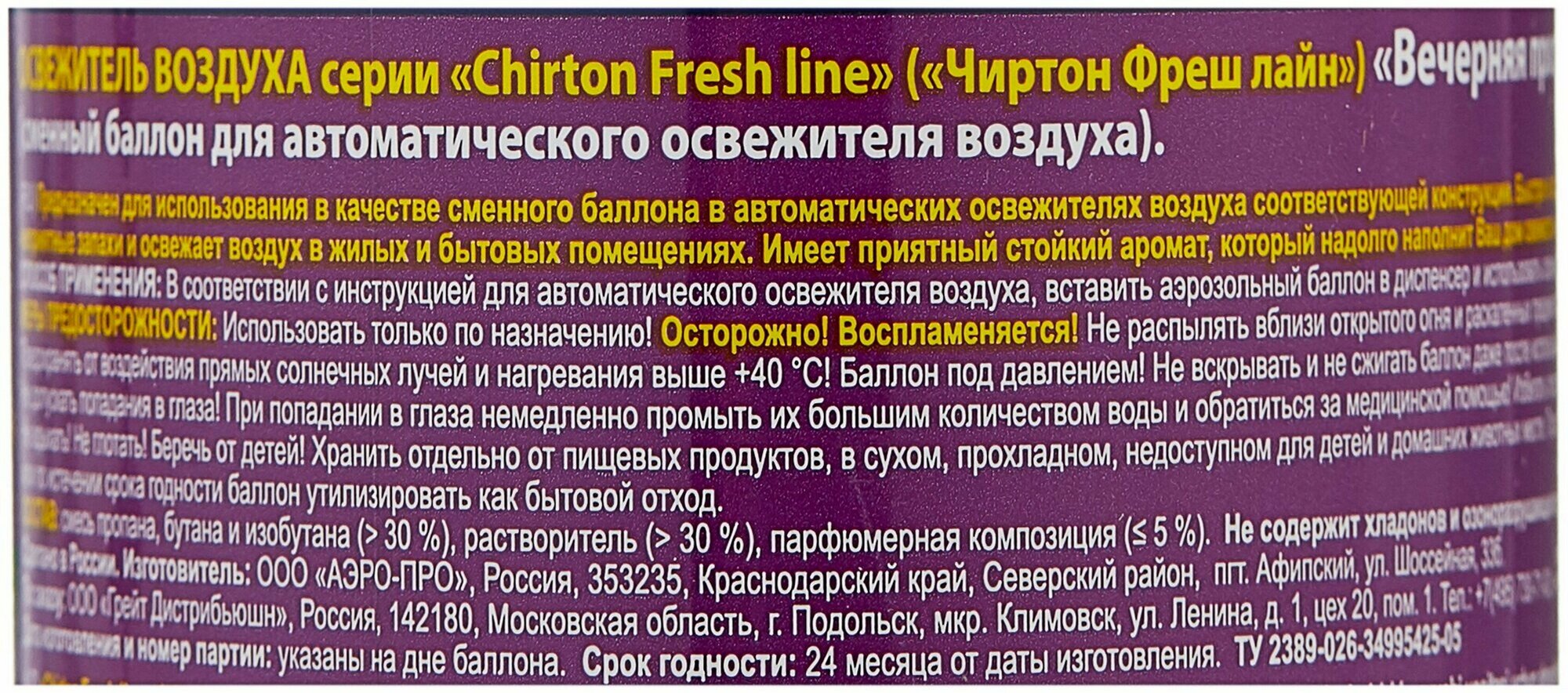 ОСВЕЖИТЕЛЬ ВОЗДУХА серии «Chirton Fresh line» («Чиртон Фреш лайн»)(сменный баллон для автоматического освежителя воздуха).Предназначен для использования в качестве сменного баллона в автоматических освежителях воздуха соответствующей конструкции. Быстро и эффективно устраняет неприятные запахи и освежает воздух в жилых и бытовых помещениях. Имеет приятный стойкий аромат, который надолго наполнит Ваш дом свежестью и уютом.Способы применения:В соответствии с инструкцией для автоматического освежителя воздуха, вставить аэрозольный баллон в диспенсер и использовать освежитель по назначению.Меры предосторожности:Использовать только по назначению! Осторожно! Воспламеняется! Не распылять вблизи открытого огня и раскаленных предметов! Предохранять от воздействия прямых солнечных лучей и нагревания выше +40 °C! Баллон под давлением! Не вскрывать и не сжигать баллон даже после использования! Раздражитель! Не допускать попадания в глаза! При попадании в глаза немедленно промыть их большим количеством воды и обратиться за медицинской помощью! Избегать попадания на кожу! Не вдыхать! Не глотать! Беречь от детей! Хранить отдельно от пищевых продуктов, в сухом, прохладном, недоступном для детей и домашних животных месте. После использования или по истечении срока годности баллон утилизировать как бытовой отход.Состав:(Вечерняя Прохлада)смесь пропана, бутана и изобутана (> 30%), растворитель (> 30%), парфюмерная композиция (? 5%).
