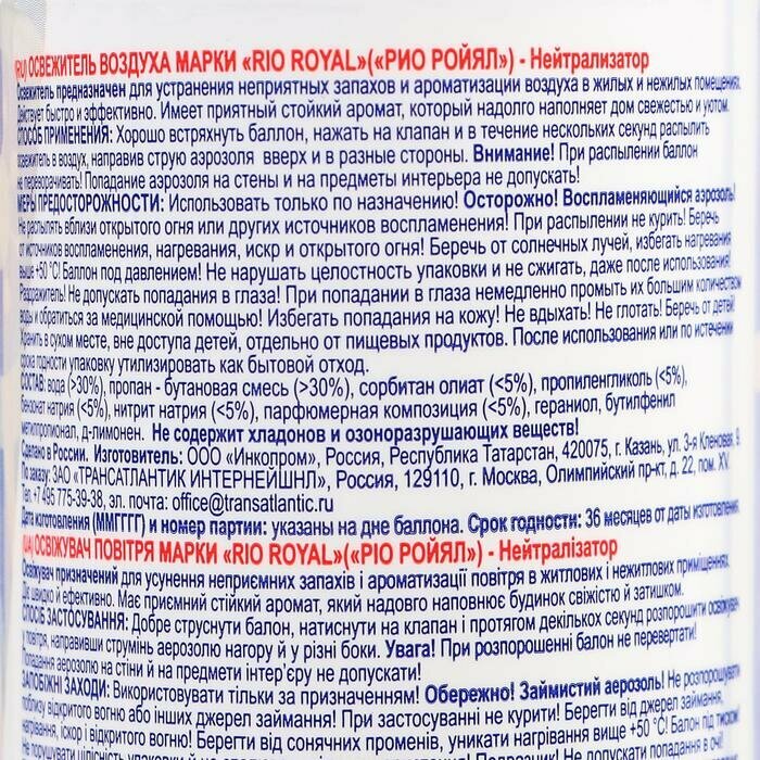 Нейтрализатор запаха для дома RIO ROYAL "Нейтрализатор" предназначен для устранения неприятных запахов в различных помещениях. Благодаря сухому распылению средство для дома не оставит в воздухе брызг и равномерно заполнит пространство.Освежитель нейтрализует запах табачного дыма, жизнедеятельности животных и другие неприятные запахи в помещении.Универсальный освежитель воздуха спрей идеально подойдет как для комнаты, так и для туалета и ванной.применение: хорошо встряхнуть освежитель воздуха в туалет и в комнату, затем нажатием на клапан в течение нескольких секунд распылить его содержимое вверх в центре помещения. Внимание: при распылении следует избегать попадания освежителя на стены и на предметы интерьера. меры предосторожности: - использовать только по назначению- не протыкать и не сжигать баллон- беречь от прямых солнечных лучей- не курить во время использования- после использования утилизировать как бытовой отходRIO ROYAL — это эффективная бытовая химия для вашего дома. Средства для дома RIO ROYAL станут незаменимым помощником при уборке и помогут создать в доме атмосферу чистоты и уюта."трансатлантик интернейшнл" — эксклюзивный дистрибьютор RIO ROYAL в России. Нажмите на название "трансатлантик интернейшнл", чтобы ознакомиться с широким ассортиментом хозяйственных товаров RIO ROYAL.