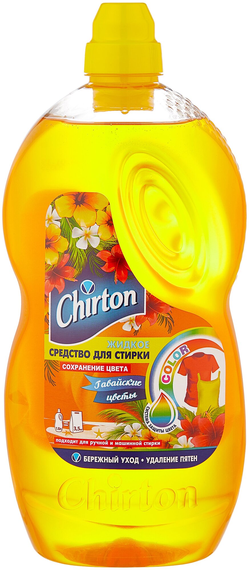 ЖИДКОЕ СРЕДСТВО ДЛЯ СТИРКИ 1810 мл «CHIRTON» "Гавайские цветы" «Для цветных тканей»Специальное синтетическое моющее средство предназначено для ручной и машинной стирки различных изделий из цветных натуральных и синтетических тканей. Хорошо растворяется в воде и великолепно отстирывает самые различные загрязнения. Отлично сохраняет фактуру тканей, а также яркость и насыщенность оригинальных цветов даже после частых стирок. Придаёт тканям свежесть и приятный аромат. Подходит для стирки всех видов разноцветных тканей, включая ткани белого и чёрного цвета.ВНИМАНИЕ! Перед стиркой следует внимательно изучить все ярлыки на изделиях из тканей и стирать их согласно имеющимся указаниям. Изделия из цветных тканей не следует стирать вместе с изделиями из белых и чёрных тканей. Не рекомендуется лить средство непосредственно на ткань. При первой стирке изделий из цветных тканей, рекомендуется проверить их на цветоустойчивость, застирав небольшой малозаметный участок ткани. При сильной потере цвета, стирку средством рекомендуется не делать.Способы применения:(рекомендуется использовать колпачок от бутылки или любую другую мерную ёмкость).Ручная стирка: Развести 80 мл (2 колпачка) средства для стирки в 10 литрах чистой воды. В полученном растворе стираемые изделия замочить на 30 минут, постирать и прополоскать в чистой воде.Машинная стирка: Залить средство для стирки в соответствующий отсек стиральной машины из расчёта 80 мл (2 колпачка) средства на 4-5 кг стираемых изделий и стирать в соответствии с инструкцией к стиральной машине. ВНИМАНИЕ! Рекомендуемая температура воды для стирки со средством: от +30 °С до +60 °С. При стирке сильнозагрязнённых изделий или при стирке в жёсткой воде указанные дозировки рекомендуется увеличить в 1,5 – 2 раза (до 120-160 мл). Машинная стирка предполагает стирку в автоматической стиральной машине бытового назначения.Меры предосторожности:Использовать только по назначению! Не глотать! Не допускать попадания в глаза! При попадании в глаза промыть их большим количеством воды! Беречь от детей! Хранить в плотно закрытой заводской упаковке.Условия хранения: отдельно от пищевых продуктов, в сухом, затемнённом месте, вдали от источников тепла, при температуре от +5 °С до +30 °С. После использования или по истечении срока годности продукцию утилизируют как бытовой отход.