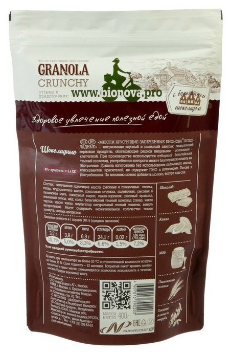 | Состав | Запеченные хрустящие мюсли (цельнозерновые овсяные хлопья, тростниковый сахар, подсолнечное масло, какао-порошок, рисовая и пшеничная мука, ячменный солод, цельнозерновые пшеничные хлопья, кокос сушеный, мед, соль), бельгийский темный шоколад (какао тертое, тростниковый сахар, какао масло, эмульгатор натуральный соевый лецитин, ваниль натуральная) |