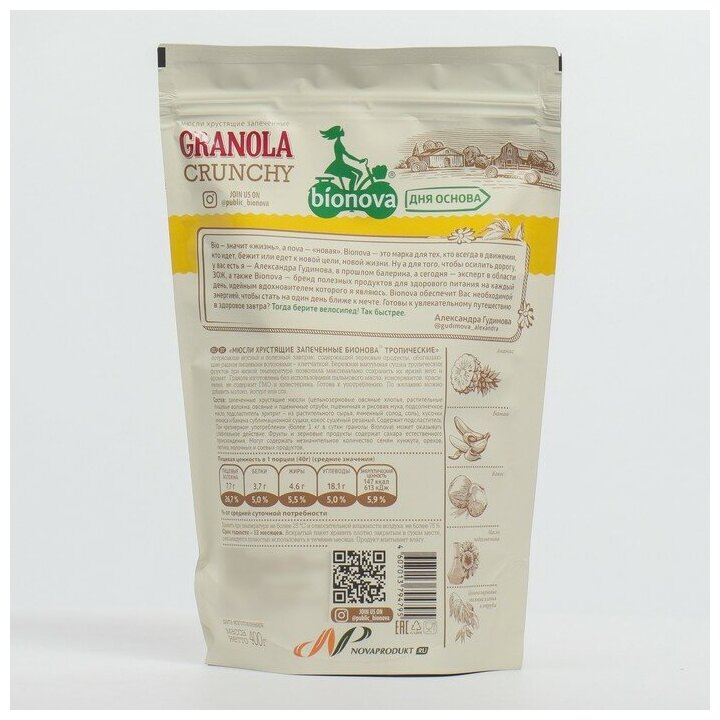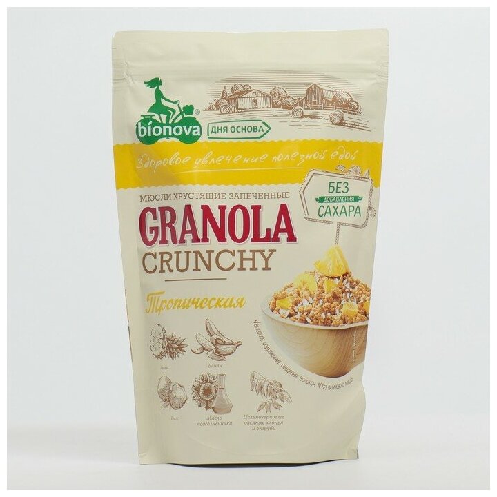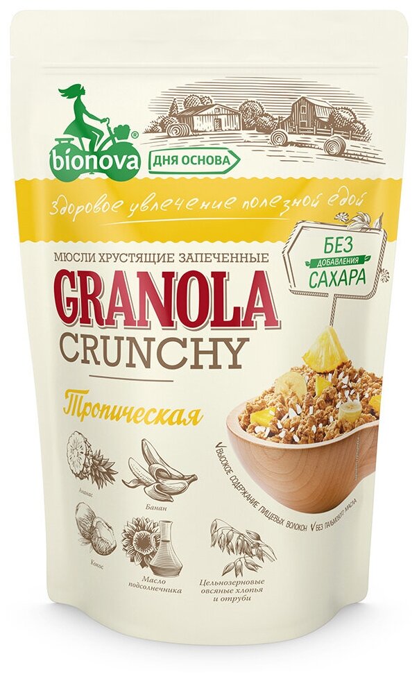 Мюсли хрустящие запеченные Бионова Тропические - потрясающе вкусный и полезный завтрак, содержащий зерновые продукты, обогащенные рацион пищевыми волокнами - клетчаткой. Бережная вакуумная сушка тропических фруктов при низкой температуре позволила максимально сохранить их яркий вкус и аромат. Гранола изготовлена без использования консервантов, красителей, не содержит ГМО и холестерина. По желанию можно добавить молоко, йогурт или сок.