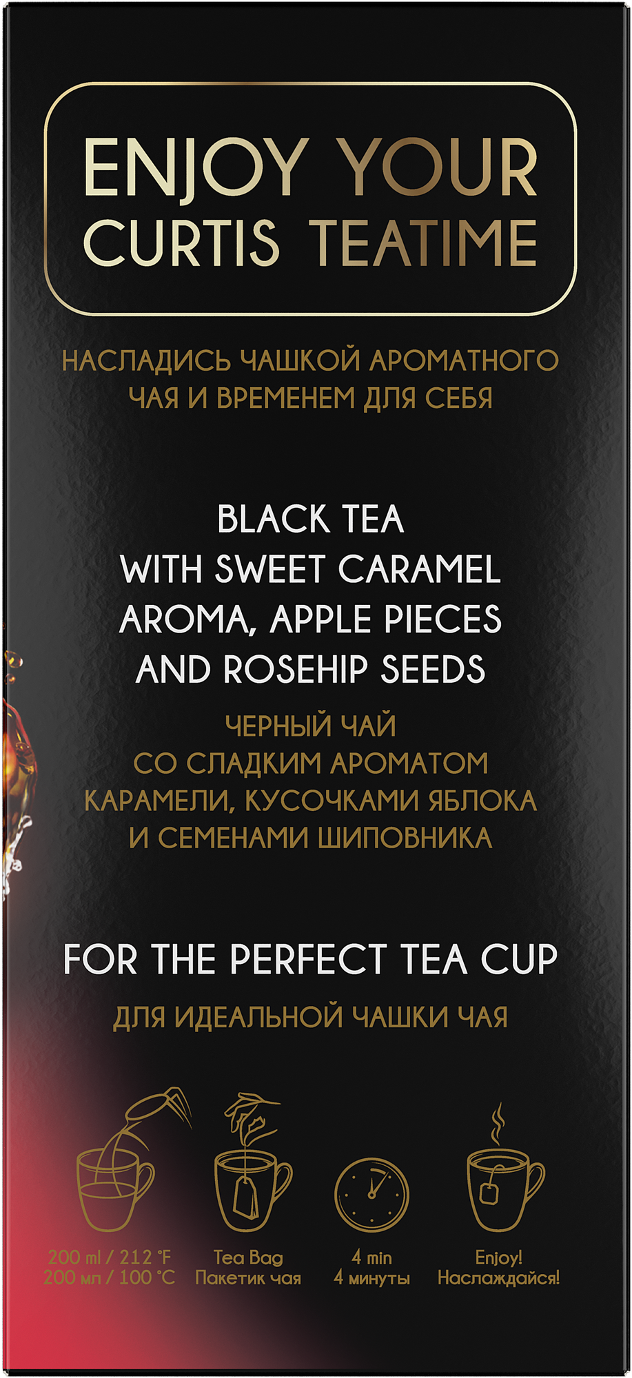 Чёрный чай в пакетиках с ароматом карамели, кусочками яблока и семенами шиповника. Найди вдохновение в каждой чашке.