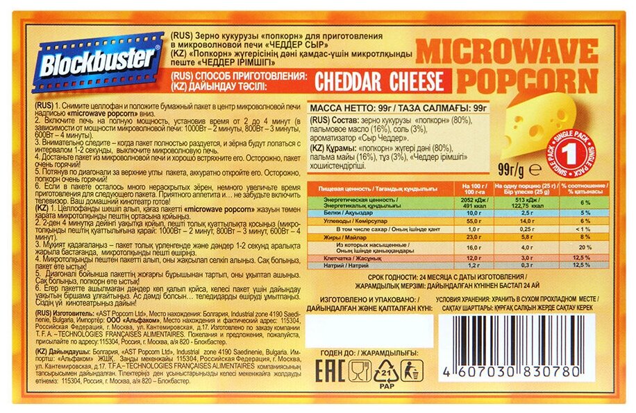 | Состав | зерно кукурузы "попкорн" (не генетически модифицированное) (80%), пальмовое масло (16%), соль (3%), натуральный и идентичный натуральному ароматизаторы "чеддер сыр", бета-каротин |