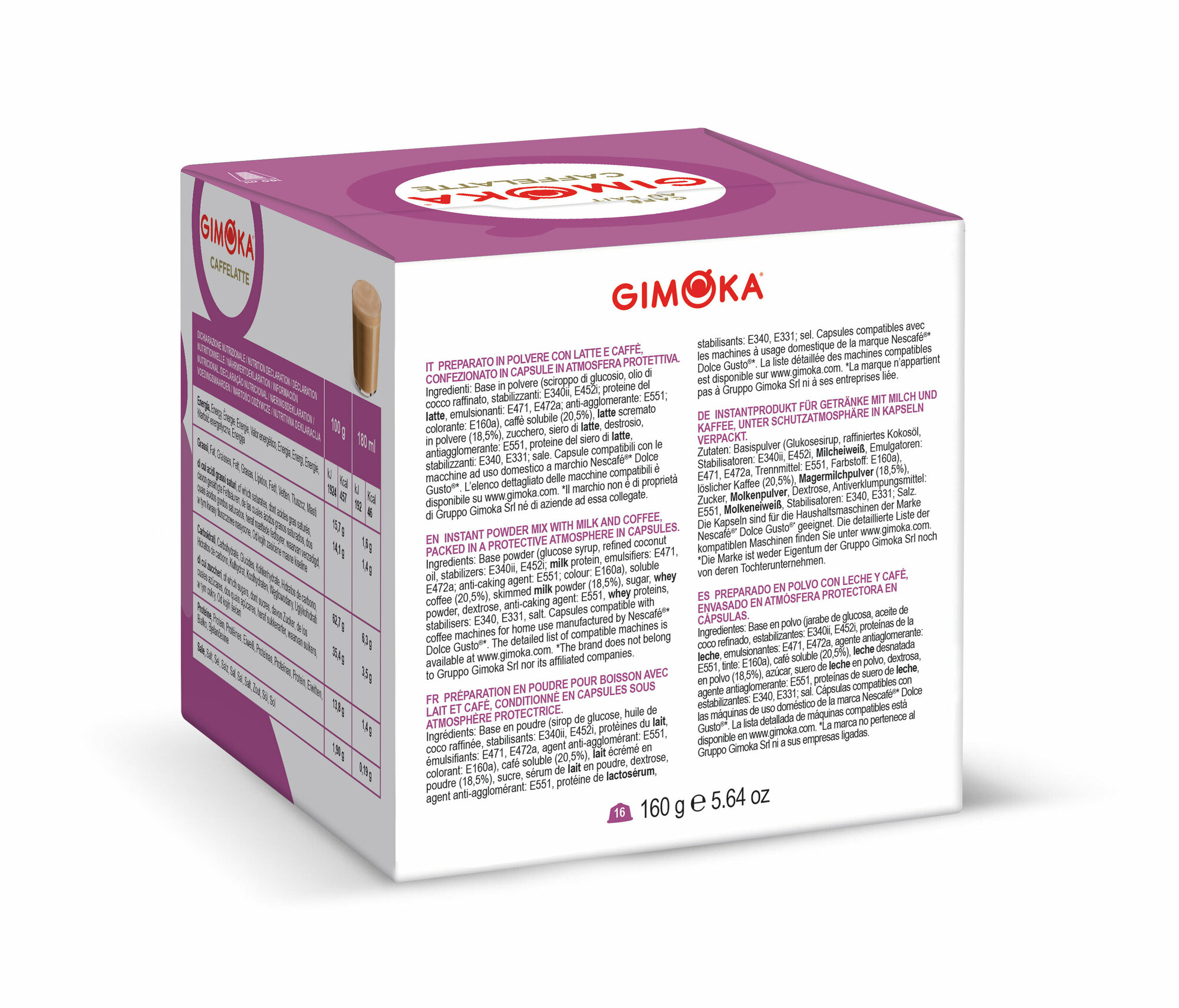 Напиток Gimoka Dolce Gusto Caffelatte. Легендарный итальянский кофе, состоящий из нескольких слоев и на вкус кажущийся еще более молочным, чем капучино. Удивительное сочетание горячего молока, насыщенного кофе и роскошной, бархатистой молочной пенки не оставит Вас равнодушным! Латте с итальянского переводится как 'пятнистое молоко'. Эспрессо наливается поверх молока, создавая своеобразный слоистый узор, который ни с чем не спутаешь, и затем переходит в изысканную молочную пену. Латте макиато украшается элегантной темной кофейной точкой в качестве легко узнаваемой подписи. Состав: арабика + робуста. Рекомендуемый объем чашки: 180 мл. Вес кофе в одной капсуле: 10 г. Способ приготовления: в капсульной кофемашине Dolce Gusto. Срок годности: 18 месяцев. Хранить в сухом прохладном месте. Страна производства: Италия.