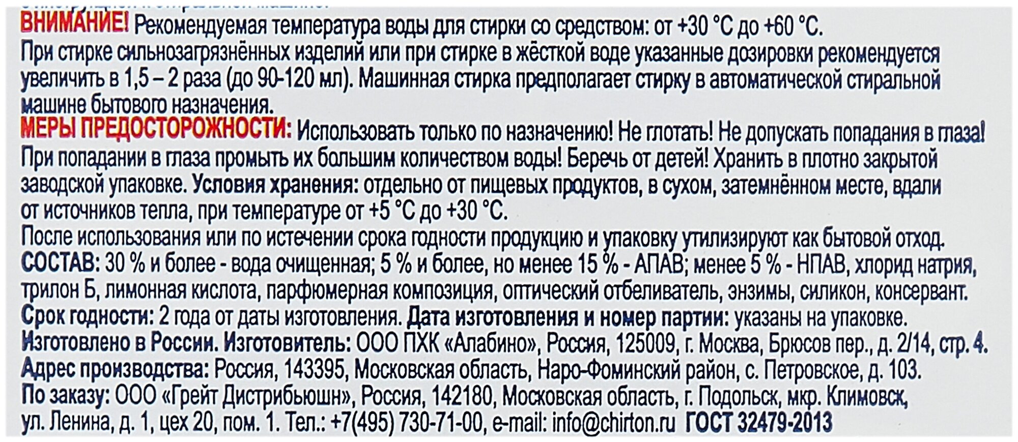 | Состав | 30 % и более - вода очищенная; 5 % и более, но менее 15 % - апав; менее 5 % - нпав, хлорид натрия, трилон б, лимонная кислота, парфюмерная композиция, оптический отбеливатель, энзимы, силикон, консерван |