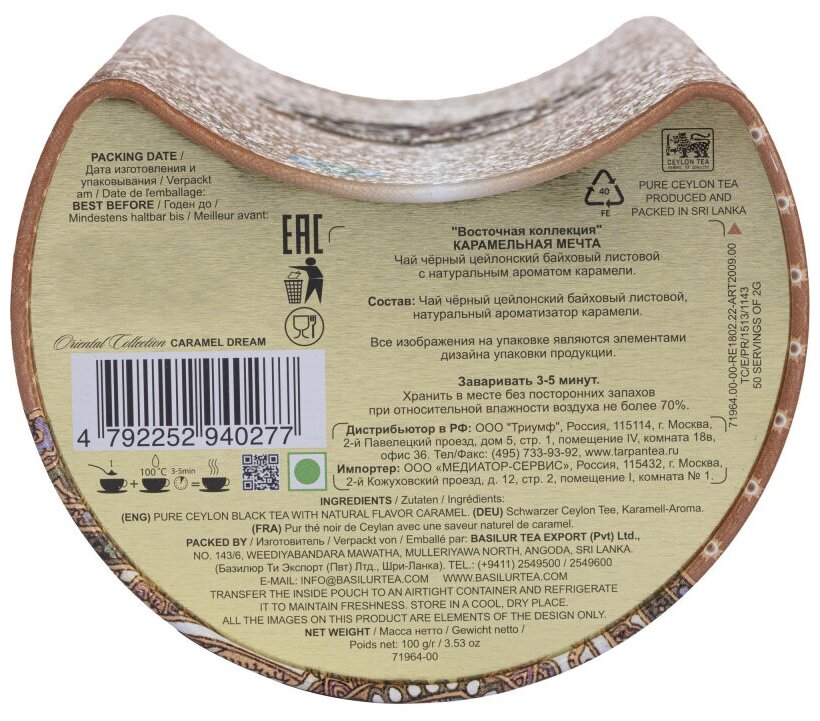 | Состав | Чай черный цейлонский, натуральный ароматизатор карамели. |