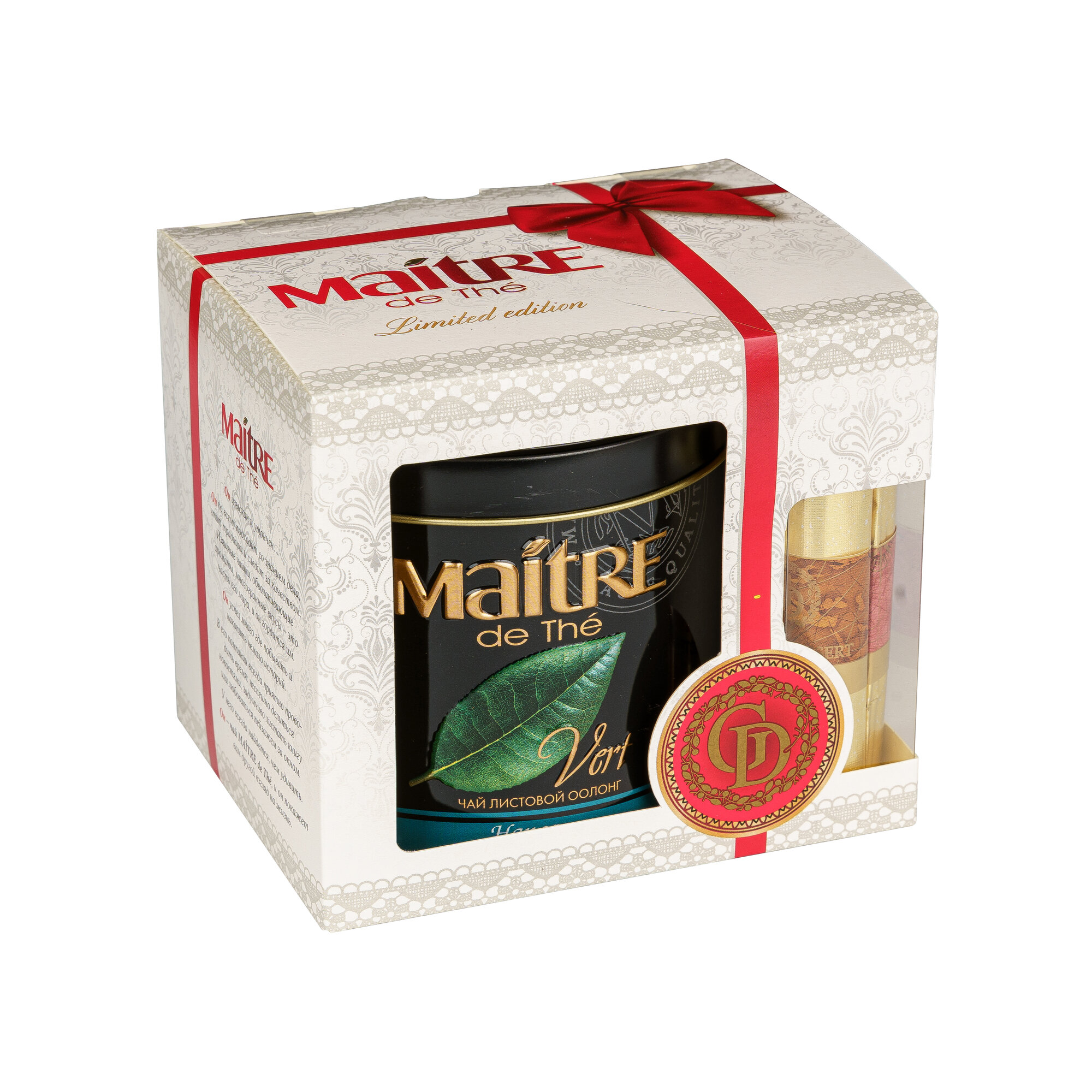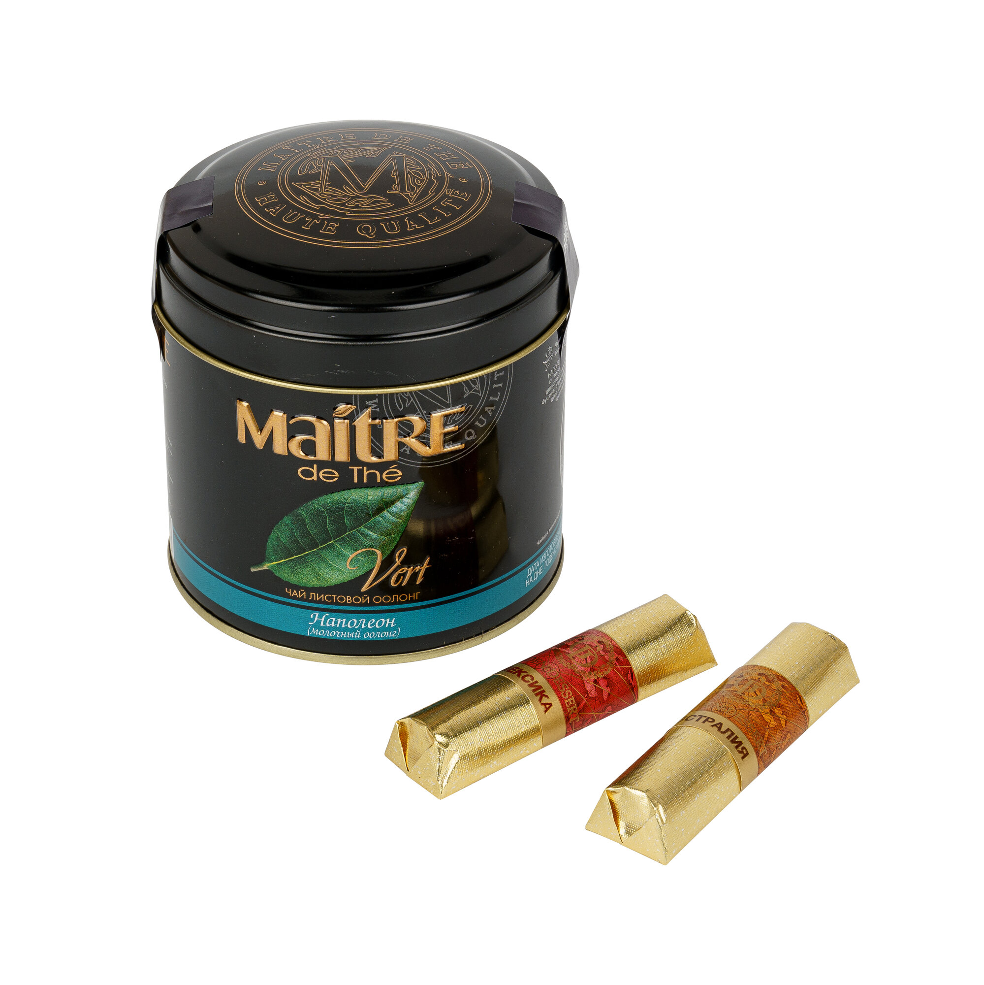 Подарочный набор чай зеленый листовой MAITRE de The Наполеон 100г и две шоколадные конфеты GOLDEN DESSERT по 22г