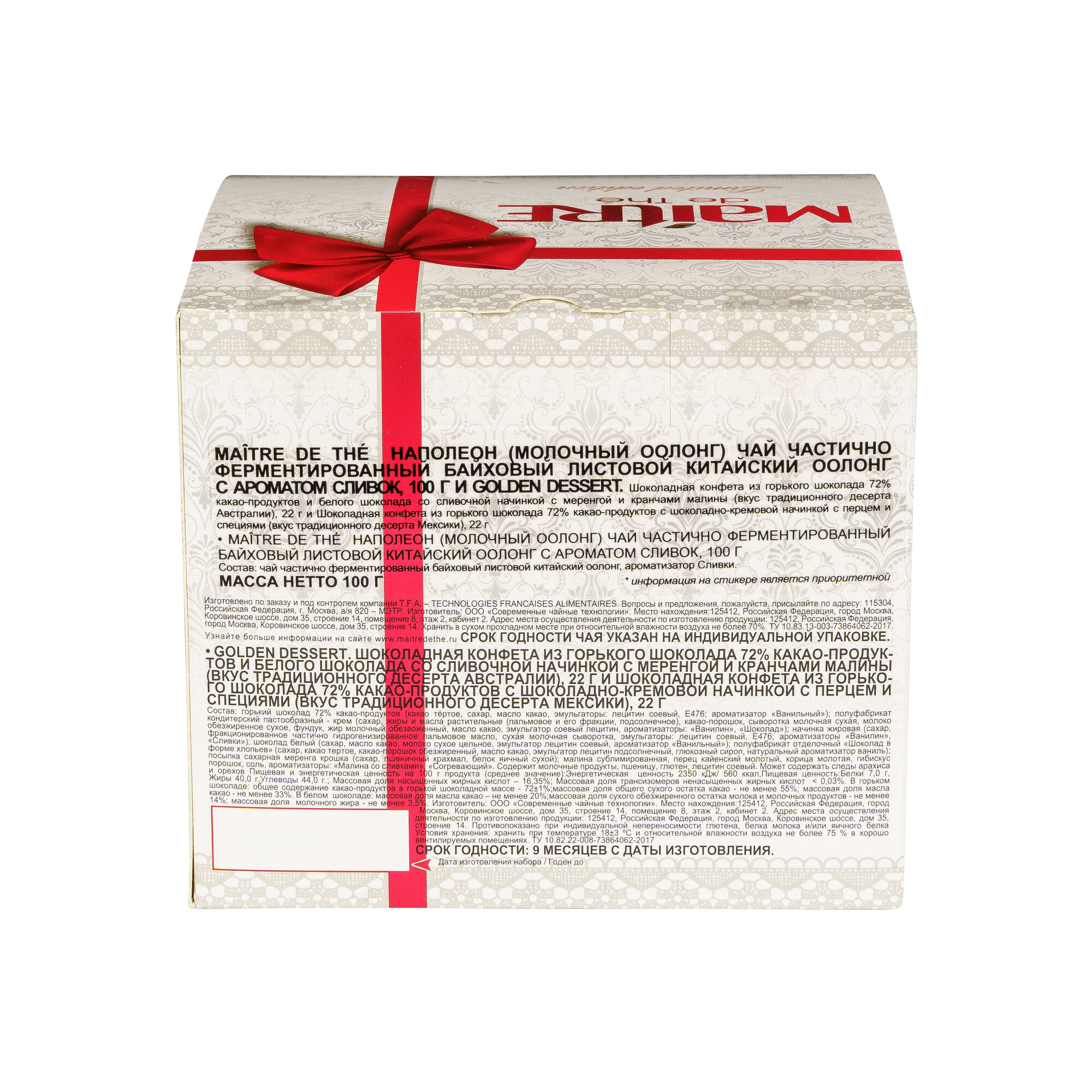 | Комплектация | Чай оолонг НАПОЛЕОН (Молочный Оолонг) 100 г 1 жестяная банка, шоколадные конфеты GOLDEN DESSERT 2 шт*22 г в индивидуальной фольгированной упаковке с обечайкой. |