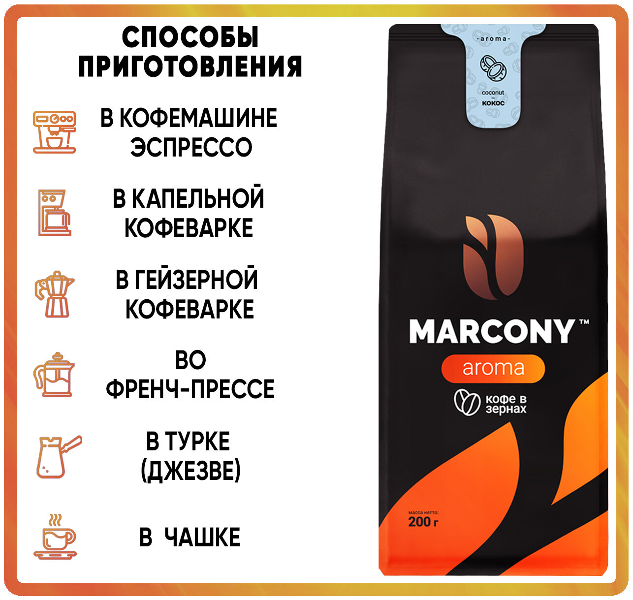 Сервис сравнения цен СкидкаГИД предлагает сравнить цены на товар «Кофе в зернах MARCONY AROMA со вкусом Кокоса (200г) м/у»