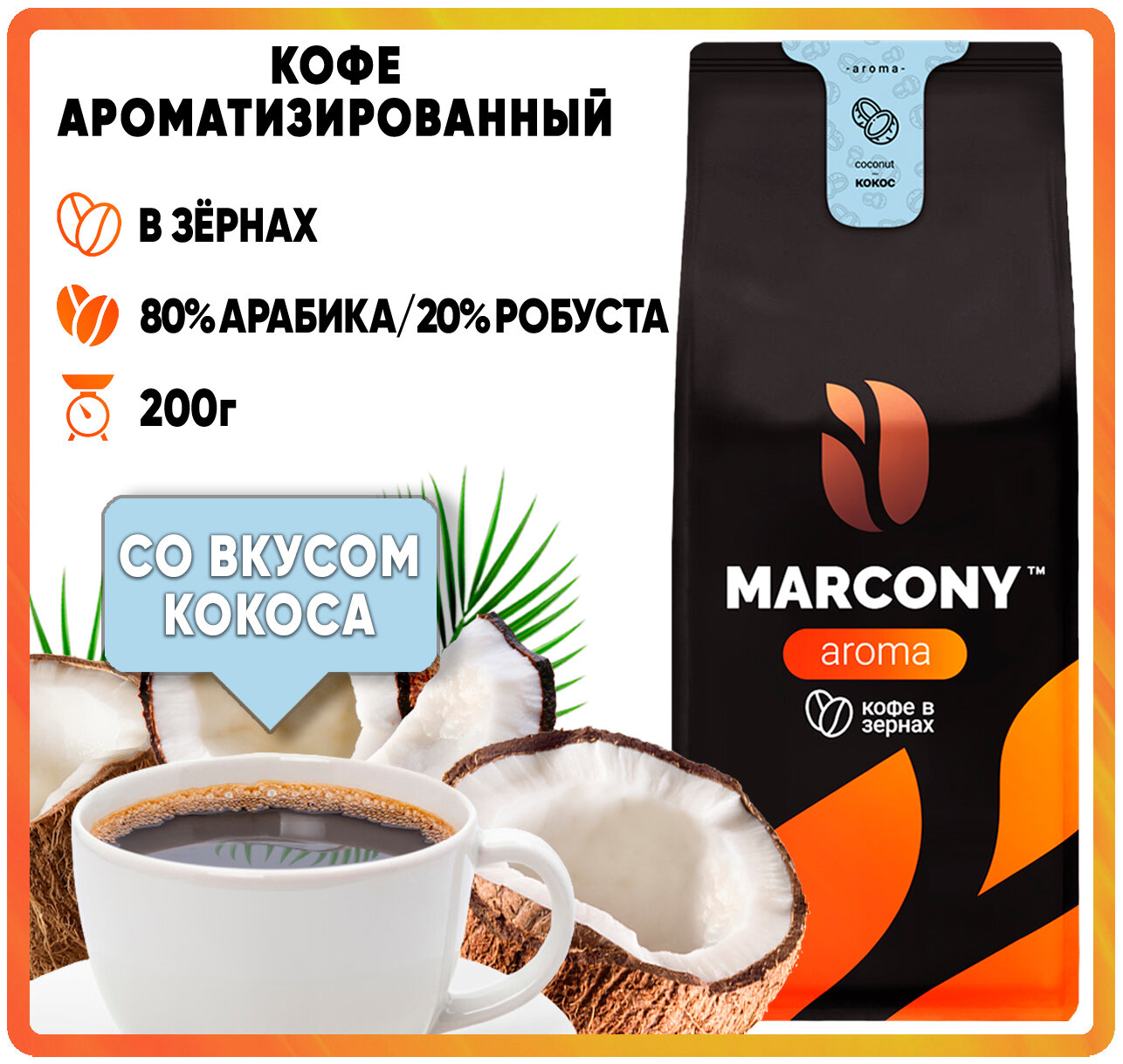 Кофе в зернах MARCONY AROMA со вкусом Кокоса (200г) м/у