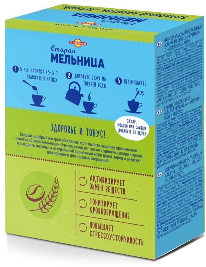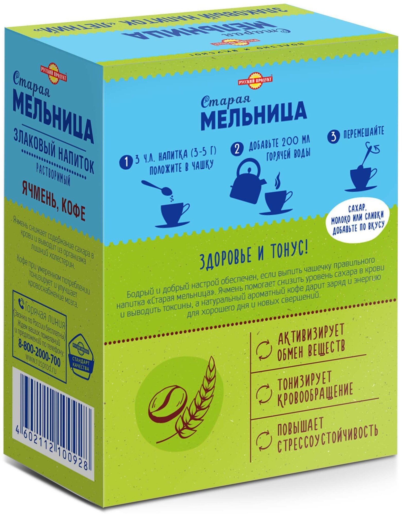 Злаковый напиток "Старая мельница" содержит ячмень и настоящий кофе. Имеет бодрящий вкус, подходит тем, кто хочет ограничить количество кофеина. Очень вкусно с молоком и сахаром!