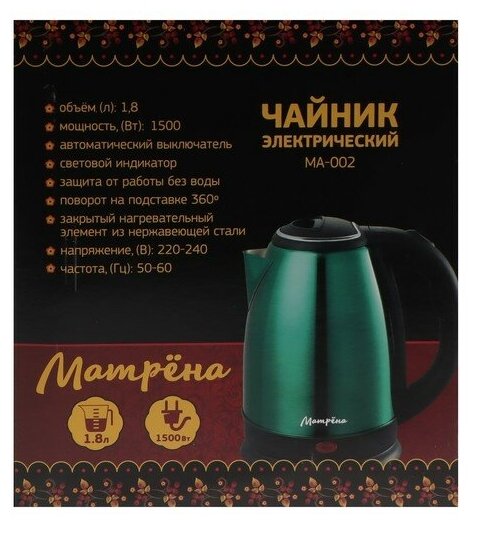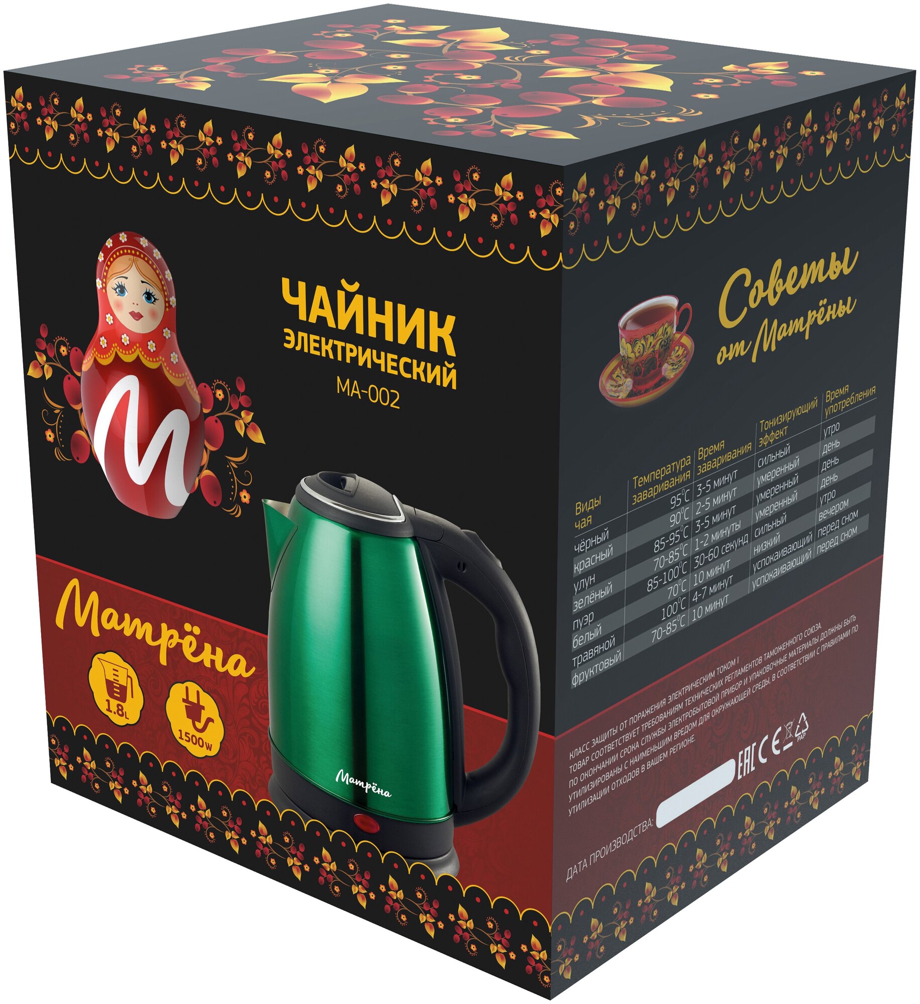 Чайник Матрена MA-002 — качественная техника для дома, дачи или небольшого офиса. Эта модель с легкостью решит вопрос быстрого нагревания или кипячения воды для приготовления блюд или напитков. Объем колбы — 1,8 литра, этого хватит для удовлетворения нужд 3-4 человек. Высокая мощность 1500 Вт позволяет быстро вскипятить воду.