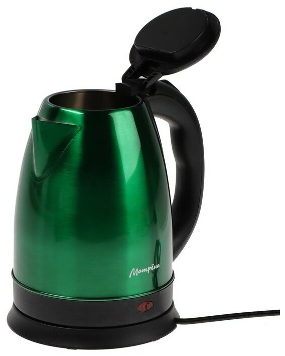 **Электрический чайник Матрёна** объёмом 1.8 л без подсветки быстро вскипятит воду благодаря мощности 1500 вт.