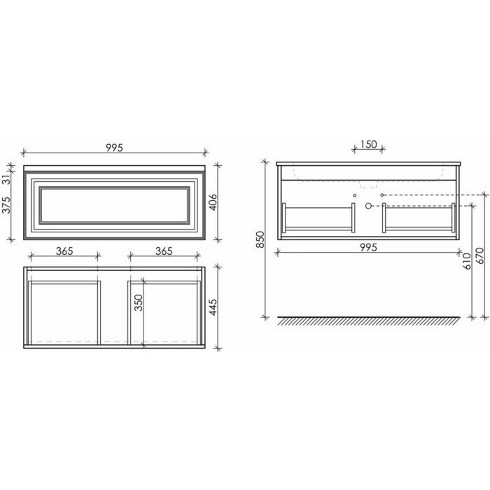 - Габариты корпуса тумбы (ШхВхГ): 995х406х445 мм.