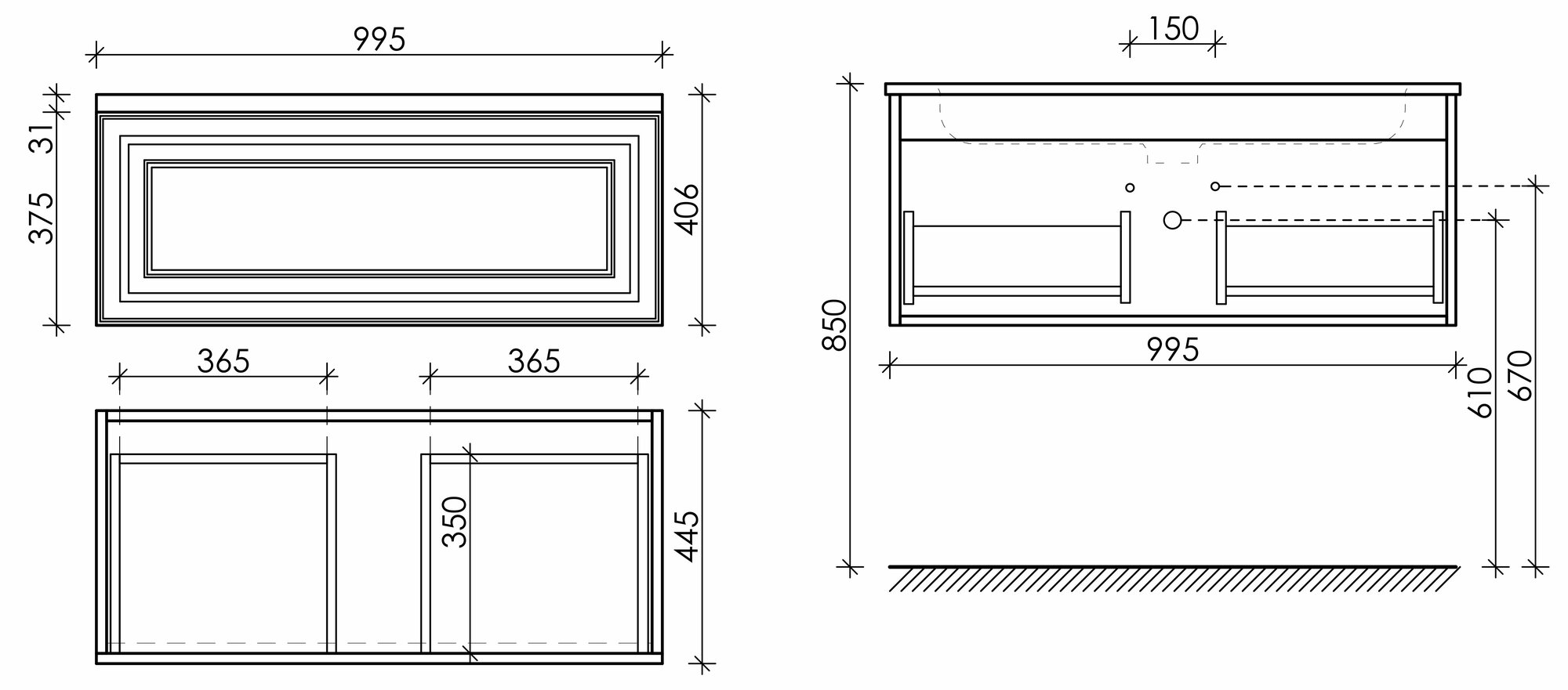 - Габариты корпуса тумбы (ШхВхГ): 995х406х445 мм.