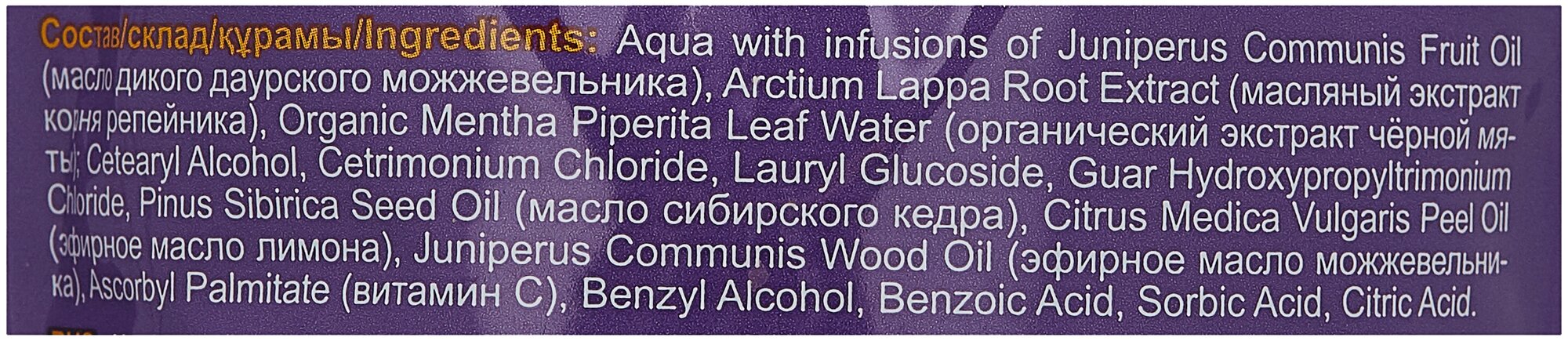 | Состав | aqua with infusions of juniperus communis fruit oil (масло дикого даурского можжевельника), arctium lappa root extract (масляный экстракт корня репейника), organic mentha piperita leaf water (органический экстракт черной мяты), cetearyl alcohol, cetrimonium chloride, lauryl glucoside, guar hydroxypropyltrimonium chloride, pinus sibirica seed oil (масло сибирского кедра), citrus medica vulgaris peel oil (эфирное масло лимона), juniperus communis wood oil (эфирное масло можжевельника), ascorbyl palmitate (витамин c), benzyl alcohol, benzoic acid, sorbic acid, citric acid |
