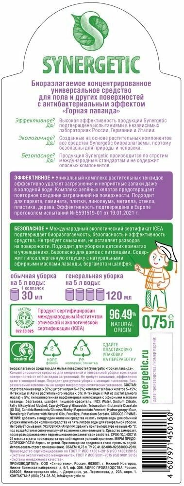 Средство для мытья полов Synergetic Горная лаванда 750 мл 4607971450160