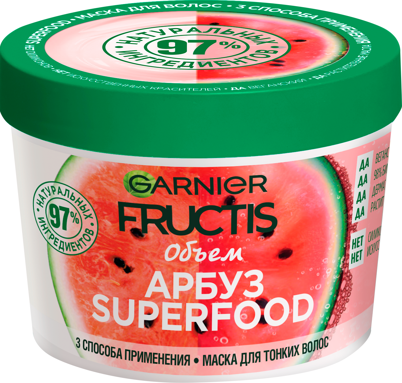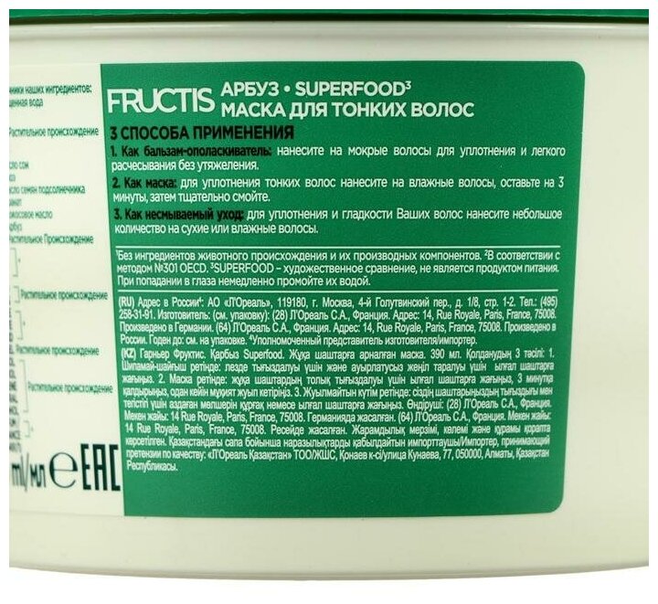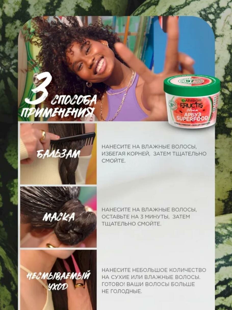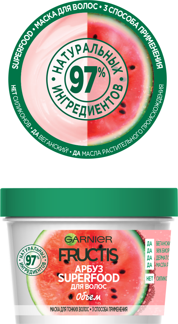 Невинное удовольствие для твоих волос - SuperFOOD с приятным ароматом Арбуза. Маска для тонких волос - это супер инновация для объема волос, которая состоит на 98% из натуральных ингредиентов и имеет 3 способа применения: как бальзам, как маска и как несмываемый уход. Формула не содержит парабенов, силиконов и искусственных красителей. 3 способа применения: