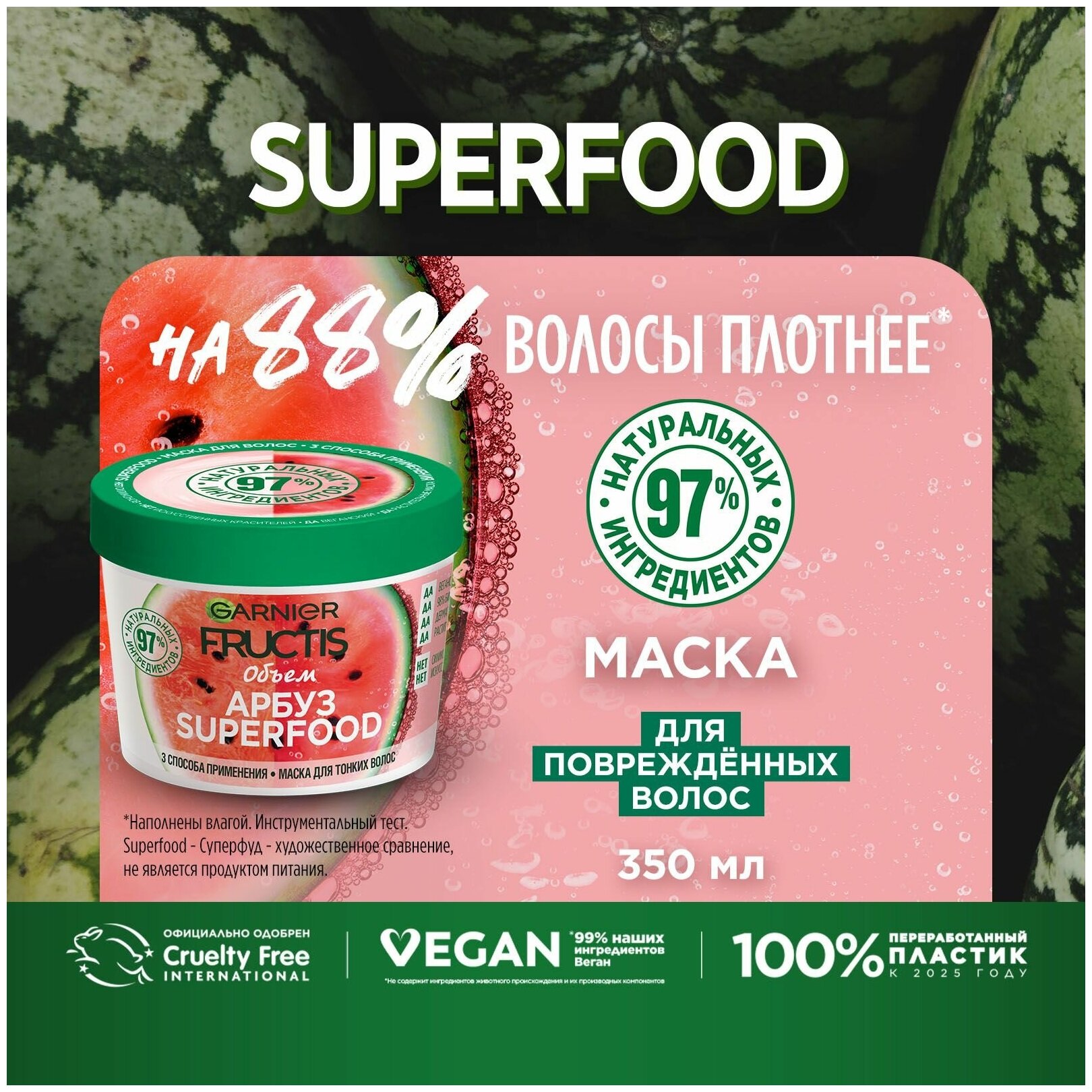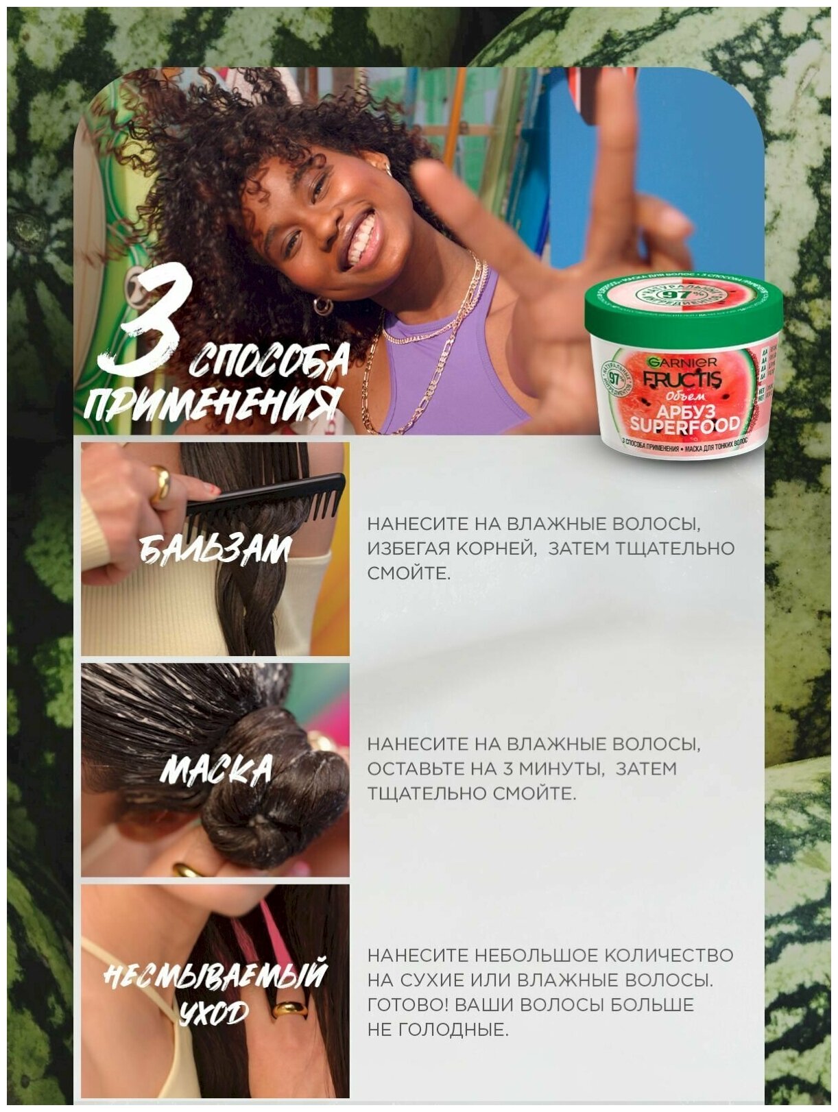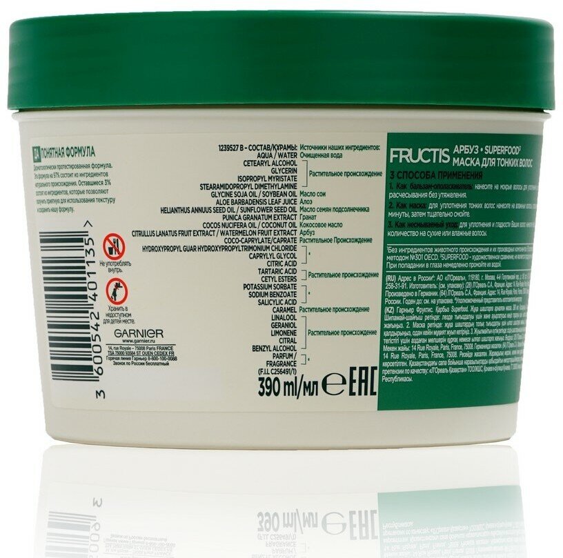 Невинное удовольствие для твоих волос - SuperFOOD с приятным ароматом Арбуза. Маска для тонких волос - это супер инновация для объема волос, которая состоит на 98% из натуральных ингредиентов и имеет 3 способа применения: как бальзам, как маска и как несмываемый уход. Формула не содержит парабенов, силиконов и искусственных красителей. 3 способа применения: