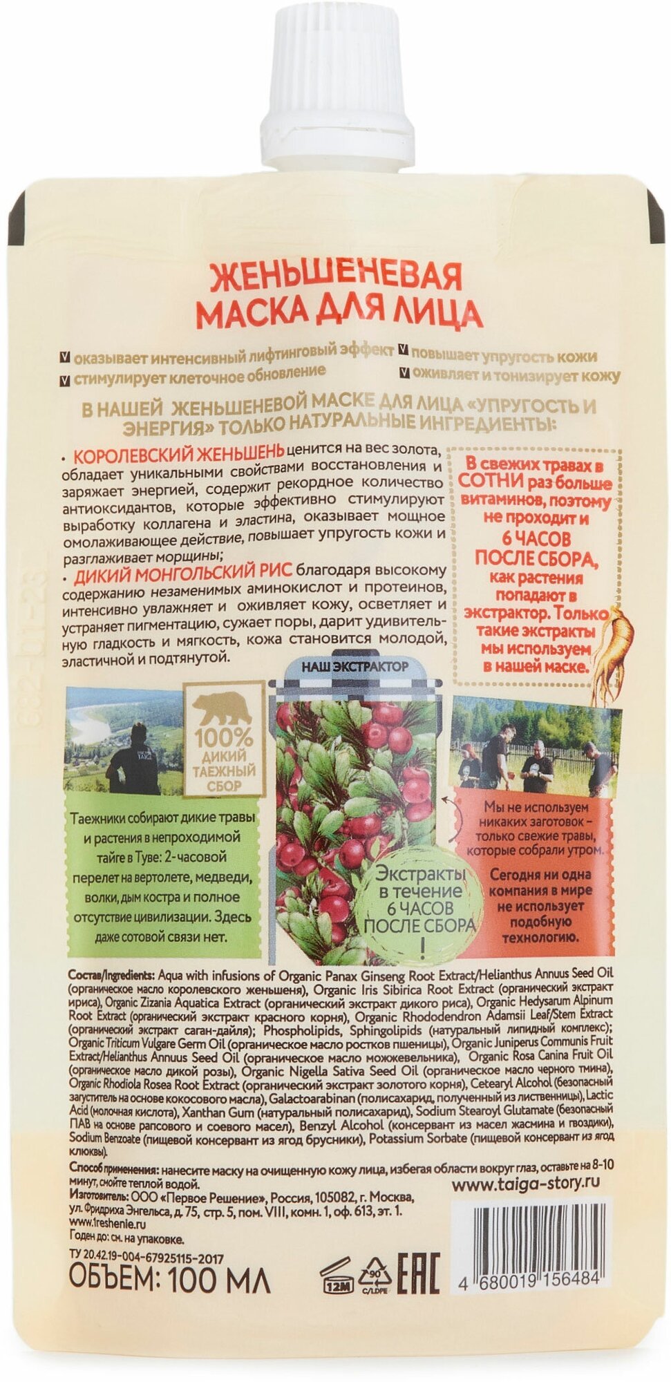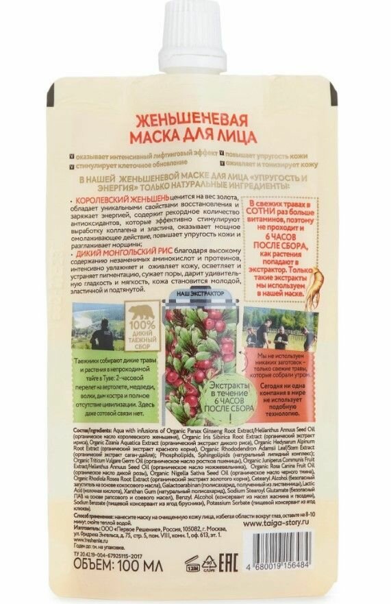 ЖЕНЬШЕНЕВАЯ МАСКА ДЛЯ ЛИЦА - оказывает интенсивный лифтинговый эффект - повышает упругость кожи - стимулирует клеточное обновление - оживляет и тонизирует кожу В НАШЕЙ ЖЕНЬШЕНЕВОЙ МАСКЕ ДЛЯ ЛИЦА УПРУГОСТЬ И ЭНЕРГИЯ ТОЛЬКО НАТУРАЛЬНЫЕ ИНГРЕДИЕНТЫ: КОРОЛЕВСКИЙ ЖЕНЬШЕНЬ ценится на вес золота, обладает уникальными свойствами восстановления и заряжает энергией, содержит рекордное количество антиоксидантов, которые эффективно стимулируют выработку коллагена и эластина, оказывает мощное омолаживающее действие, повышает упругость кожи и разглаживает морщины; ДИКИЙ МОНГОЛЬСКИЙ РИС благодаря высокому содержанию линолевой жирной кислоты, незаменимых аминокислот и протеинов, интенсивно увлажняет и оживляет кожу, осветляет и устраняет пигментацию, сужает поры, дарит удивительную гладкость и мягкость, кожа становится молодой, эластичной и подтянутой.