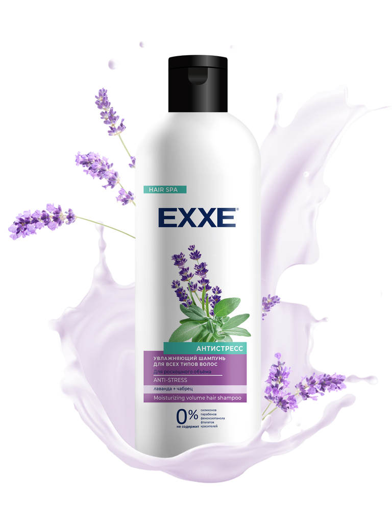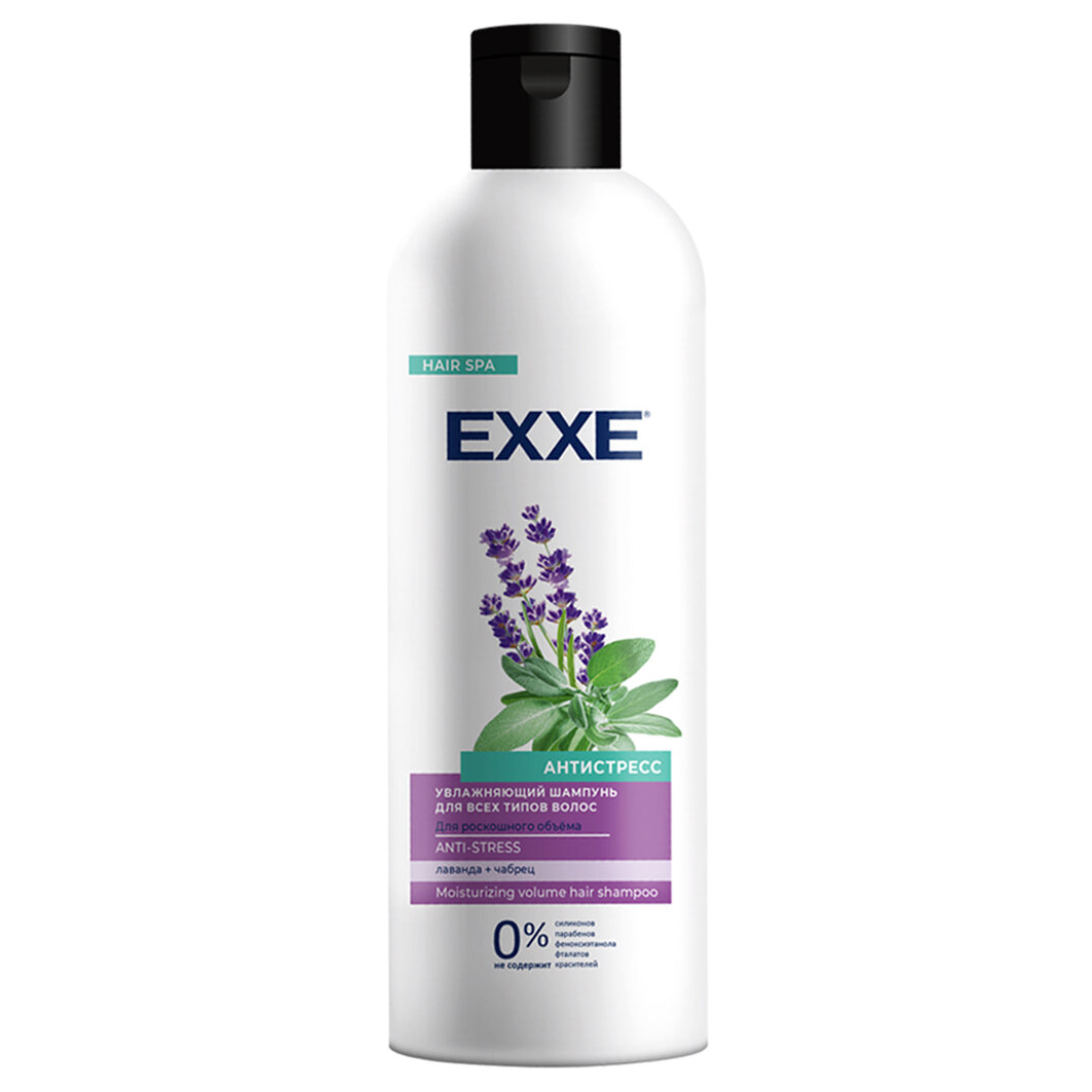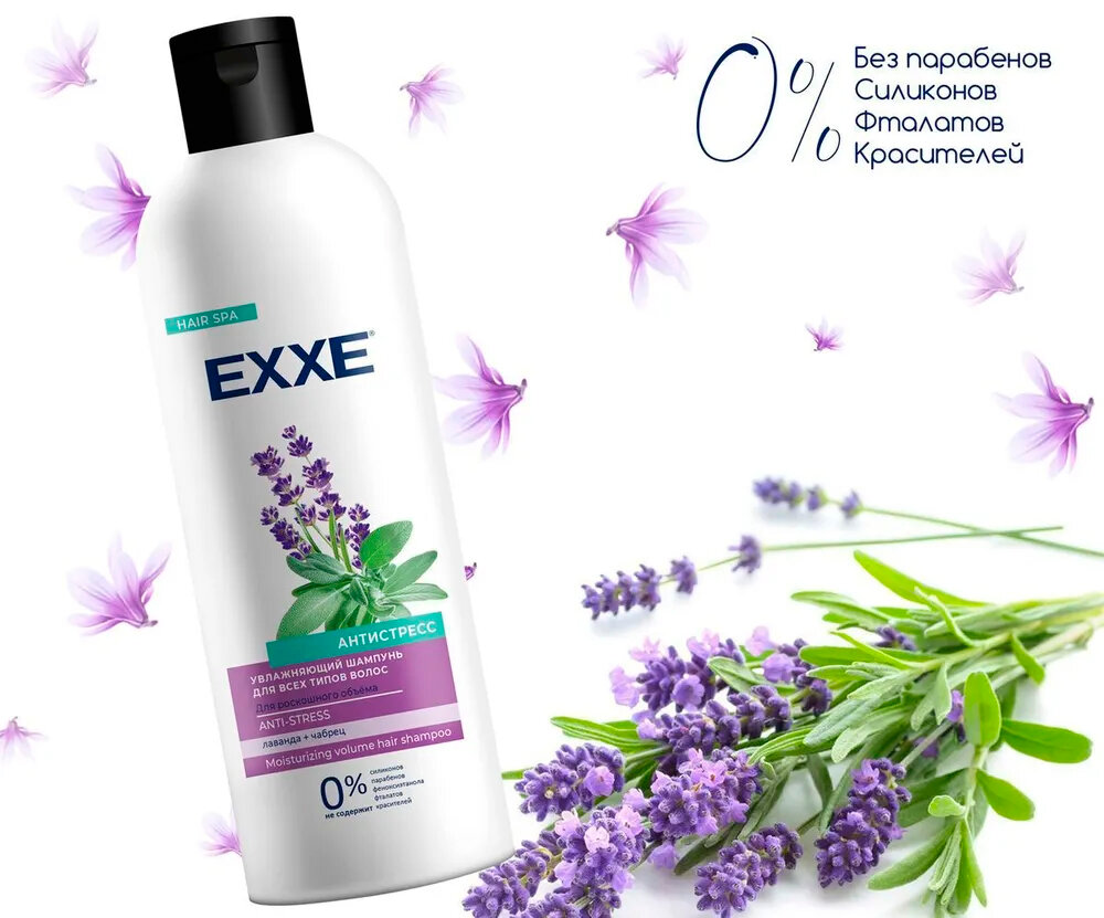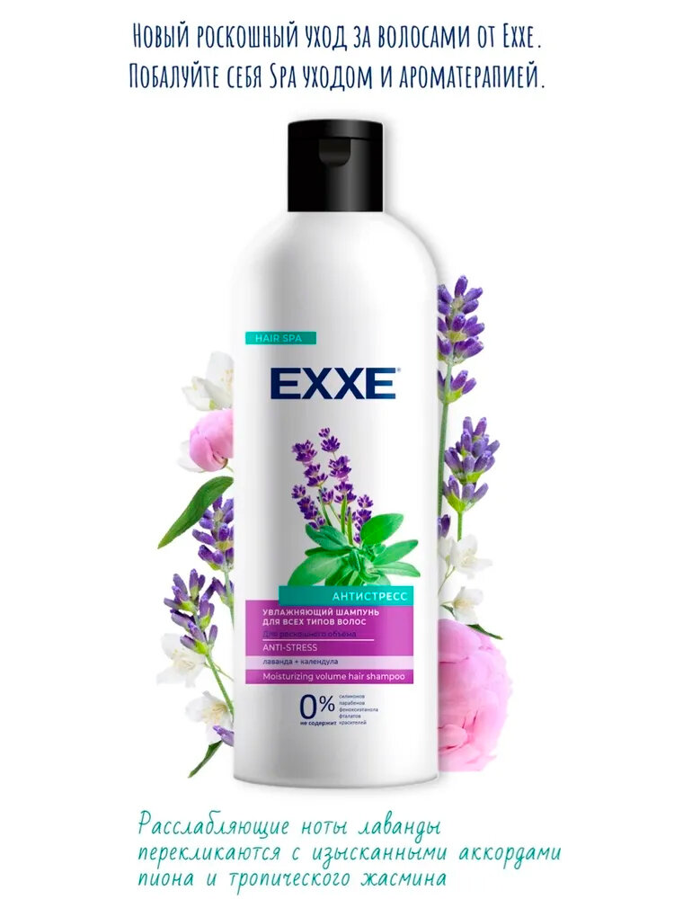 Exxe Антистресс увлажняющий шампунь для всех типов волос. Мягкая формула с пантенолом идеально подходит для ежедневного ухода за волосами и придания воздушного объема! Увлажняет, обеспечивает легкое расчёсывание и прикорневой объём, делает волосы послушными и гладкими. Экстракт календулы и аромат лаванды подарят антистресс эффект вашим волосам! Современная активная формула: натуральные растительные компоненты; без парабенов, силиконов и красителей; эффективный и комплексный уход за волосами и кожей головы.