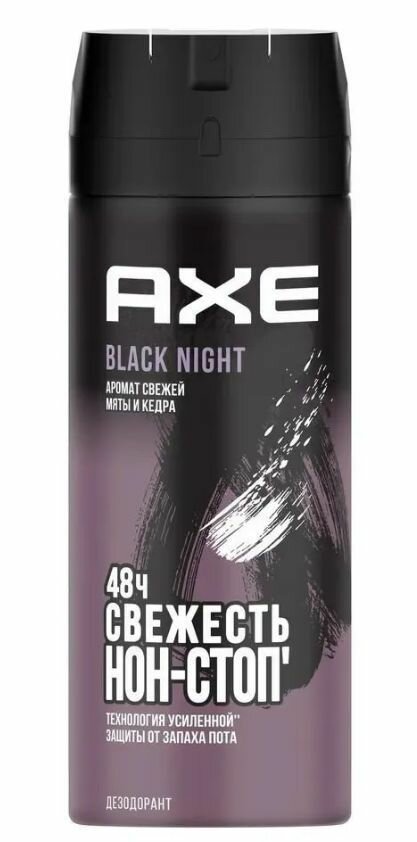 Мистический аромат AXE BLACK NIGHT для твоей самой непредсказуемой ночи. Дезодорант - аэрозоль отлично подходит для тех мужчин которые ценят максимальный комфорт. Ты не теряешь ни минуты: просто встряхни баллон и 2-3 секунды распыляй аэрозоль на чистую сухую кожу. Одного взмаха будет достаточно для полного преображения. Теплый аромат ванили и элегантные древесные ноты для загадочного и утонченного мужчины. Не оставляет следов и пятен на одежде и не блокирует потовые железы, придавая уверенность в себе на весь день, каждый день и в любой ситуации.Забудь про белые следы на одежде и стянутость кожи. Открой свою индивидуальность. Будь тем кем ты мечтал быть вместе с Axe! AXE это многообразие ароматов, которые нравятся именно вам. Аэрозольные мужские дезодоранты - для тех, кто ценит легкость и привык брать с собой в путешествие, на веселые вечеринки букет из удивительных ароматов, то есть настоящих романтиков, гелевые мужские антиперспиранты - для отчаянных сорвиголов, спортсменов, которые не признают компромиссов. Выбирай свой набор AXE. Будь готов к любой ситуации. AXE представляет свою философию: Найди свою силу. Мы предлагаем свежие, яркие, популярные ароматы и полезные продукты. 2017 год стал поворотным в истории AXE. Новая философия бренда призывает парней сосредоточиться на том, чтобы нравится в первую очередь самому себе. Выразительные ароматы табака и амбры, бодрящие нотки мяты, мускуса и имбиря, не останутся незамеченными. Новые антиперспиранты AXE защита от пятен. Защита от запаха. Усиленная защита помогут каждому найти свою силу.