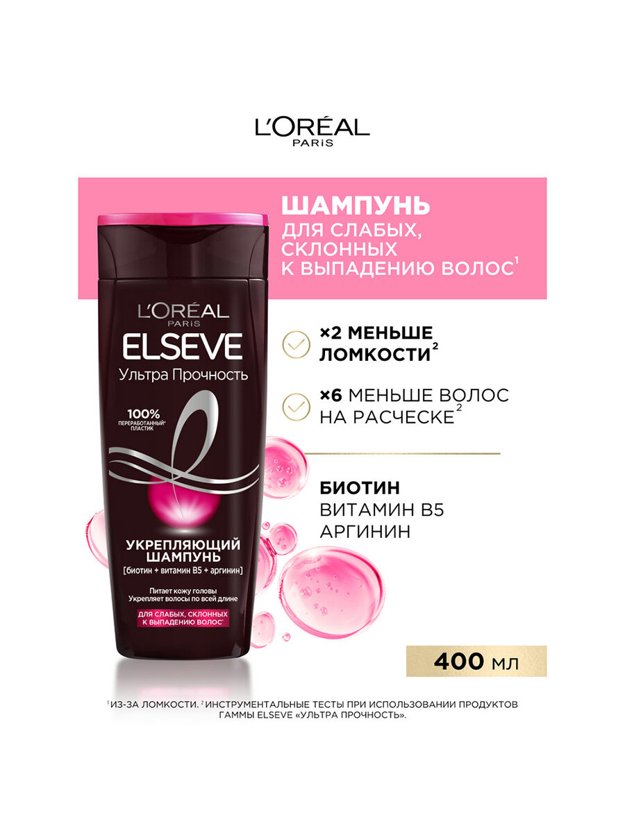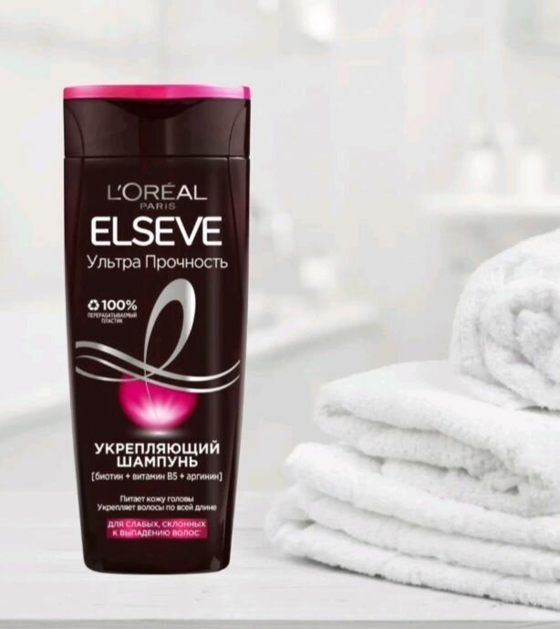 Встречайте укрепляющий шампунь Elseve Ультра Прочность с биотином, витамином В5 и аргинином в составе для ломких и ослабленных волос. Питает кожу голову и укрепляет по всей длине. Уникальная формула укрепляющего шампуня Эльсев Ультра Прочность наполнена активными добавками, которые питают кожу головы и укрепляют волосы по всей длине: биотин + витамин В5 + аргинин.