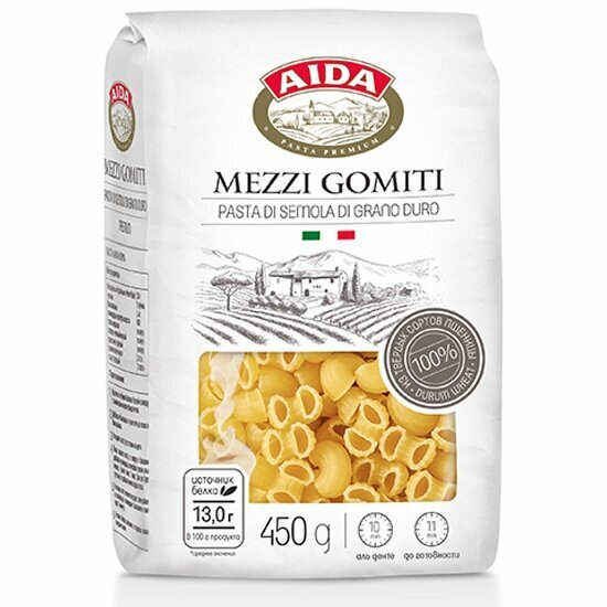 Mezzi gomiti Рожки - вид коротких макаронных изделий, с итальянского название переводится как "маленькие локотки", в России их чаще всего называют "рожки". Размеры изделий Aida - длина 15мм, диаметр 8,5мм.