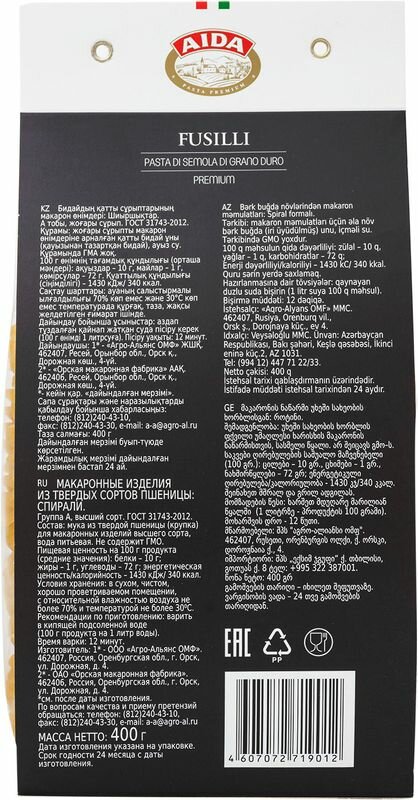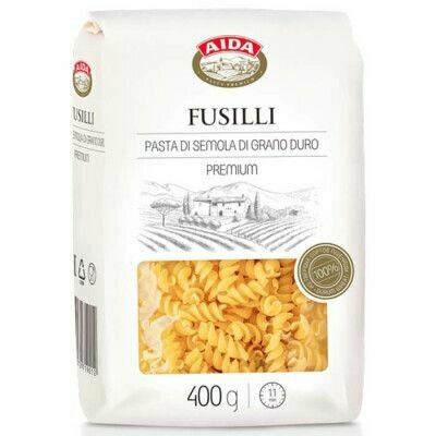 Макароны Aida Fusilli 400г производятся исключительно из крупки твердых сортов пшеницы и чистой питьевой воды.
