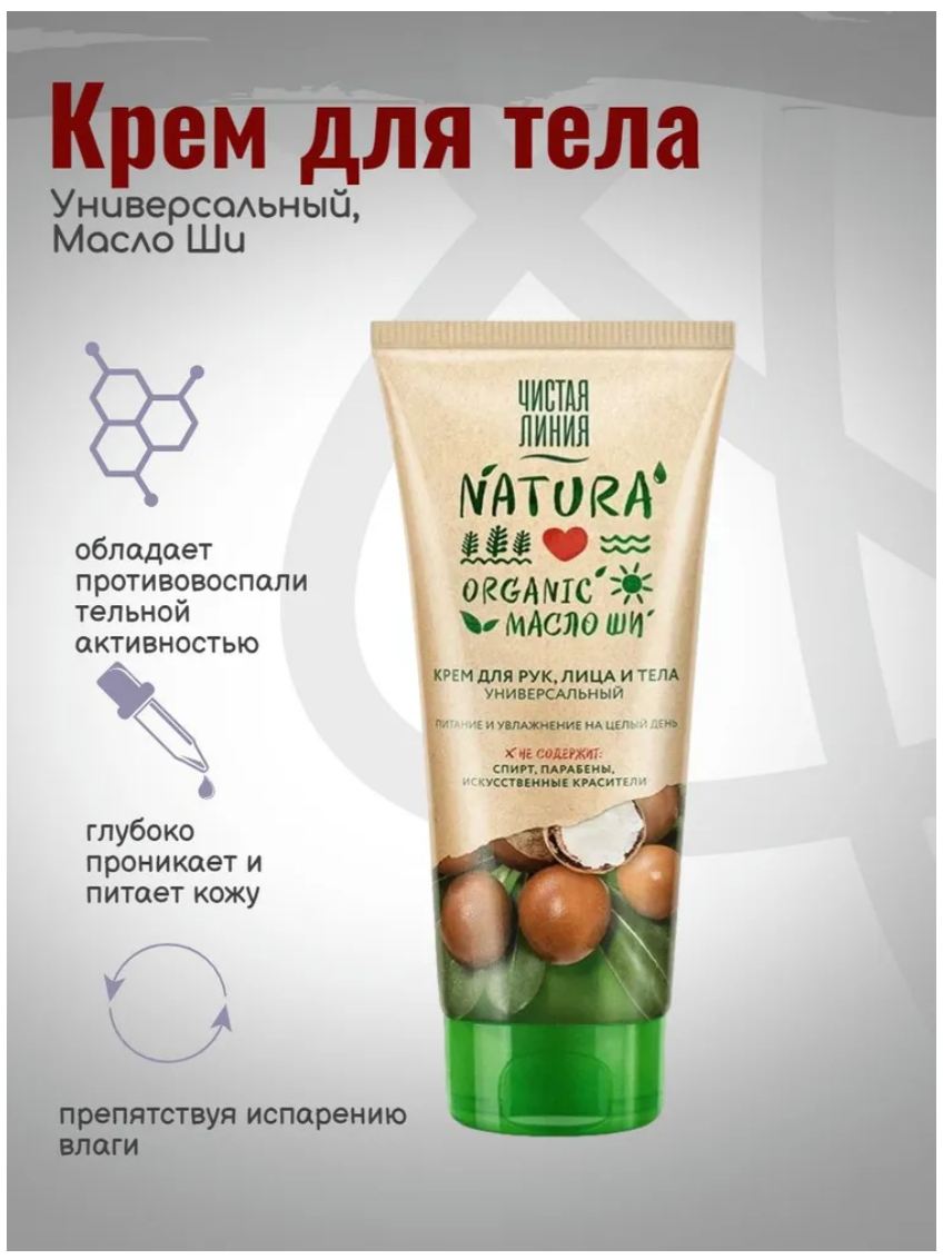 Подарите своей коже нежный и бережный уход по выгодной цене! Универсальный крем Чистая Линия благодаря своей специальной формуле подходит для рук, лица и тела. Комплекс натуральных компонентов обеспечивает нежный уход за вашей кожей. Активный компонент масло шиповника содержит полиненасыщенные жирные кислоты, а также витамины группы В, благодаря чему экстракт насыщает кожу витаминами, оказывает тонизирующее действие и увлажняет ее.