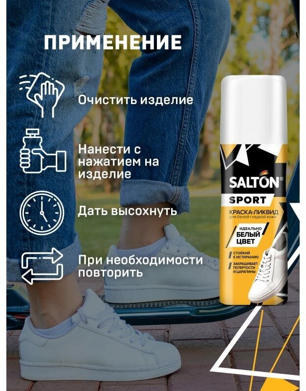 Salton Sport белая краска для обуви и подошвы это быстрый и простой способ замаскировать потертости, неровности и царапины, которые неизбежно появляются в процессе ношения, восстановить новизну вашей любимой пары кроссовок и продлить срок ее службы. Специальные навыки вам при этом не потребуются: это средство для обуви снабжено удобным аппликатором, который поможет точечно распределить краску белую по поверхности даже при наличии цветных вставок. А усиленный закрашивающий эффект и стойкость к истиранию обеспечат максимально насыщенный цвет на долгое время даже на подошвах. Обратите внимание, что краску для обуви белую можно использовать не только для обуви, но и других аксессуаров из кожи или текстиля. Краска для кроссовок поможет сохранить свежий вид белой обуви.