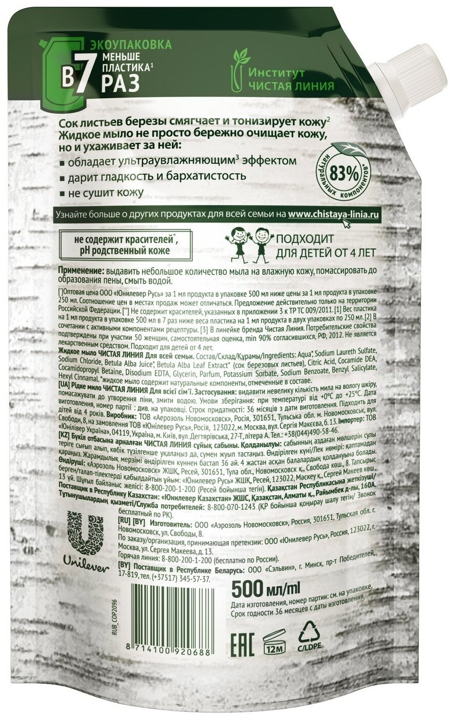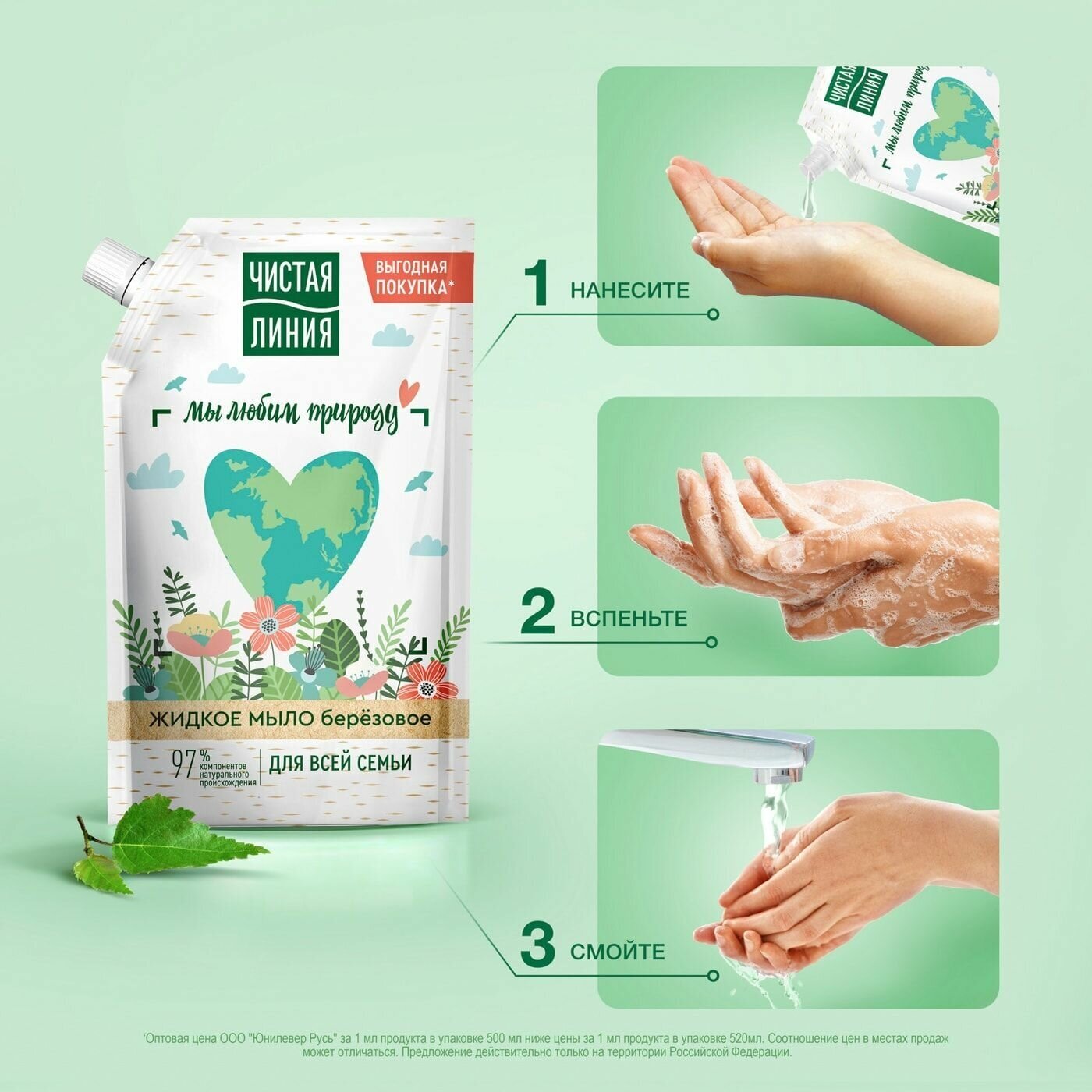 Жидкое мыло Чистая линия Для всей семьи Березовое обеспечивает бережный уход за кожей, смягчая и тонизируя ее. Натуральные компоненты мягко очищают, дарят гладкость и бархатистость. Подходит для детей от 3-х лет. Результат: кожа мягко очищена и увлажнена.До сих пор на нашей планете не было создано силы более сбалансированной, могущественной и вечной, чем сила природы. Поэтому мы изучаем полезные свойства растений и их впечатляющие способности к адаптации, исследуем благотворное действие их экстрактов, вытяжек и эссенций на кожу и волосы, чтобы усилить ими наши продукты.Ассортимент средств Чистая линия включает в себя множество косметических линий, которые обеспечивают комплексный уход за волосами, лицом и телом для поклонников бренда разных возрастов. Чистая Линия забота о красоте в нашей природе! Попробуйте также Чистая Линия жидкое мягкое крем-мыло с ромашкой Детское от 0 месяцев 250 мл и Чистая Линия жидкое крем-мыло Двойное увлажнение 250 мл.Бренд Чистая Линия бережно относится к окружающей среде: мы заряжаем продукты природной пользой для вас, при этом предпринимая меры по сохранению нашей общей зеленой планеты для будущих поколений. Мы закупаем 100% возобновляемую электроэнергию, полученную с использованием энергии ветра, для производства продукции на наших фабриках в Екатеринбурге и Санкт-Петербурге, а также направляем 100% производственных отходов на утилизацию, отличную от передачи на полигон: на переработку или дальнейшее использование в других отраслях. Бренд Чистая Линия заботится о нашей природе.