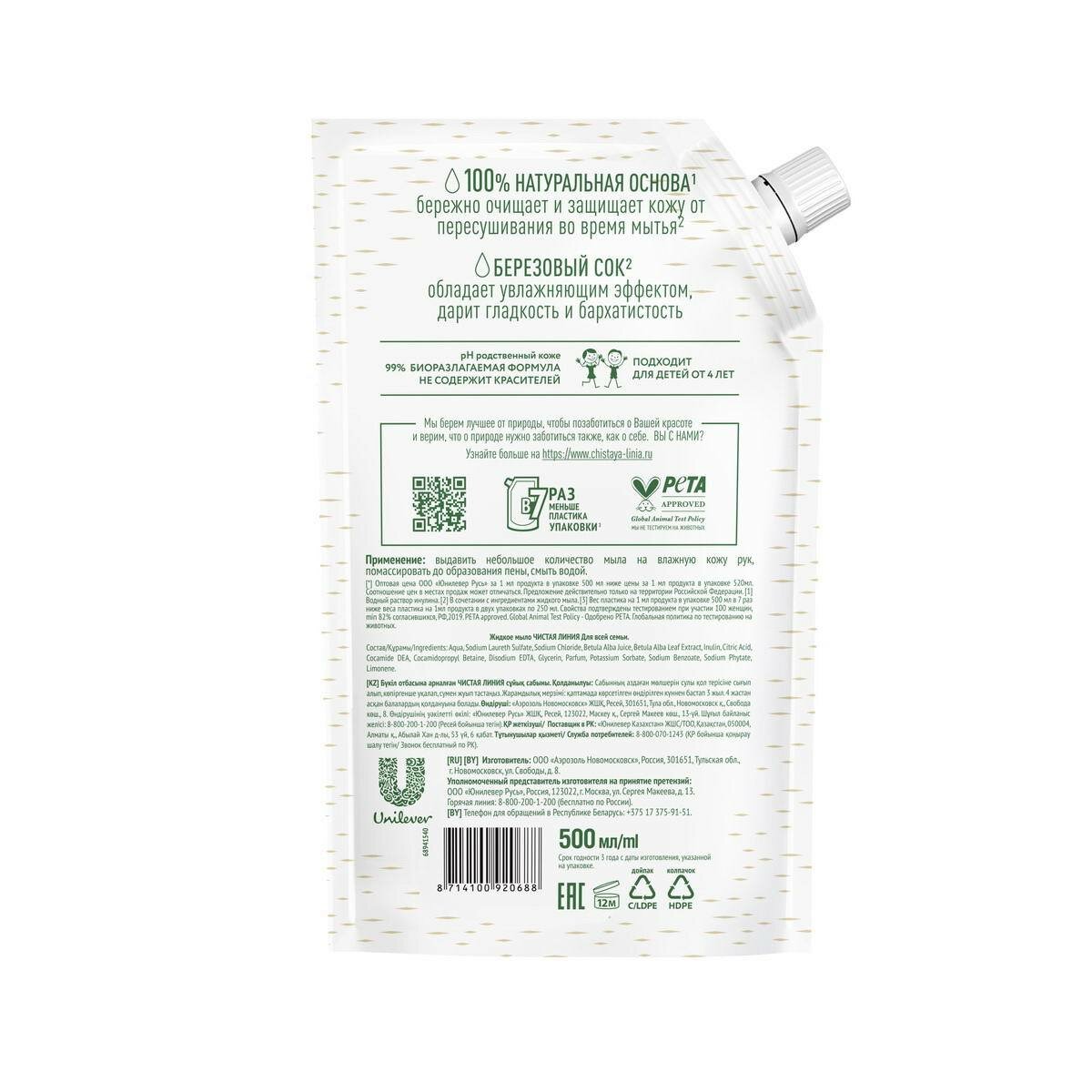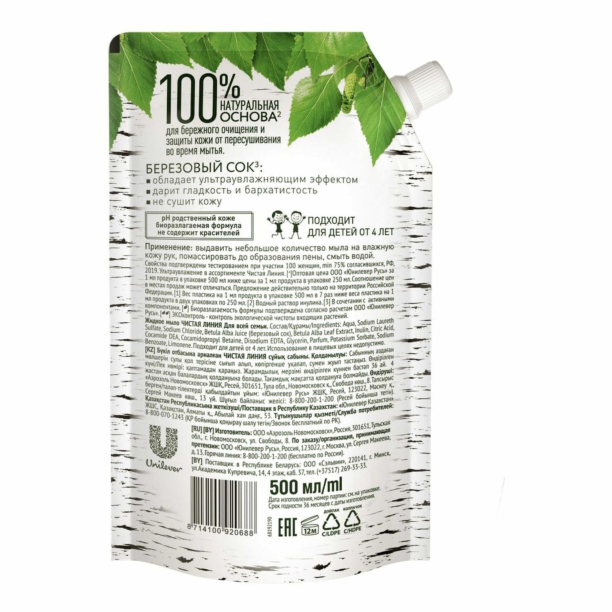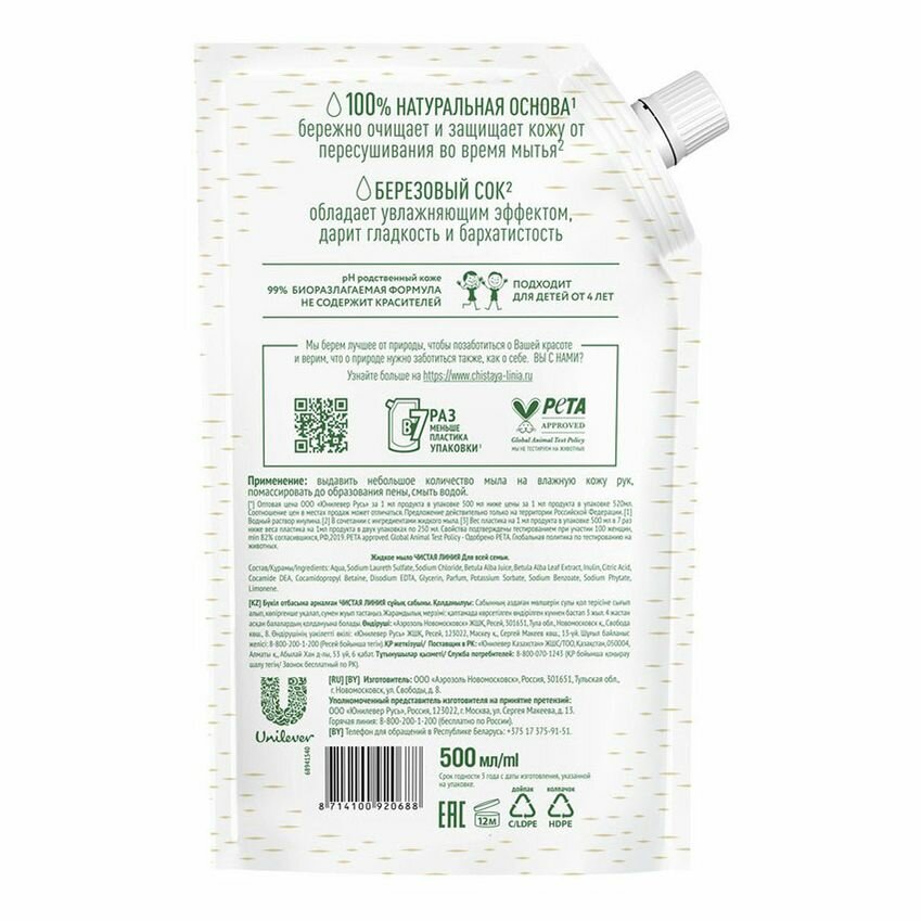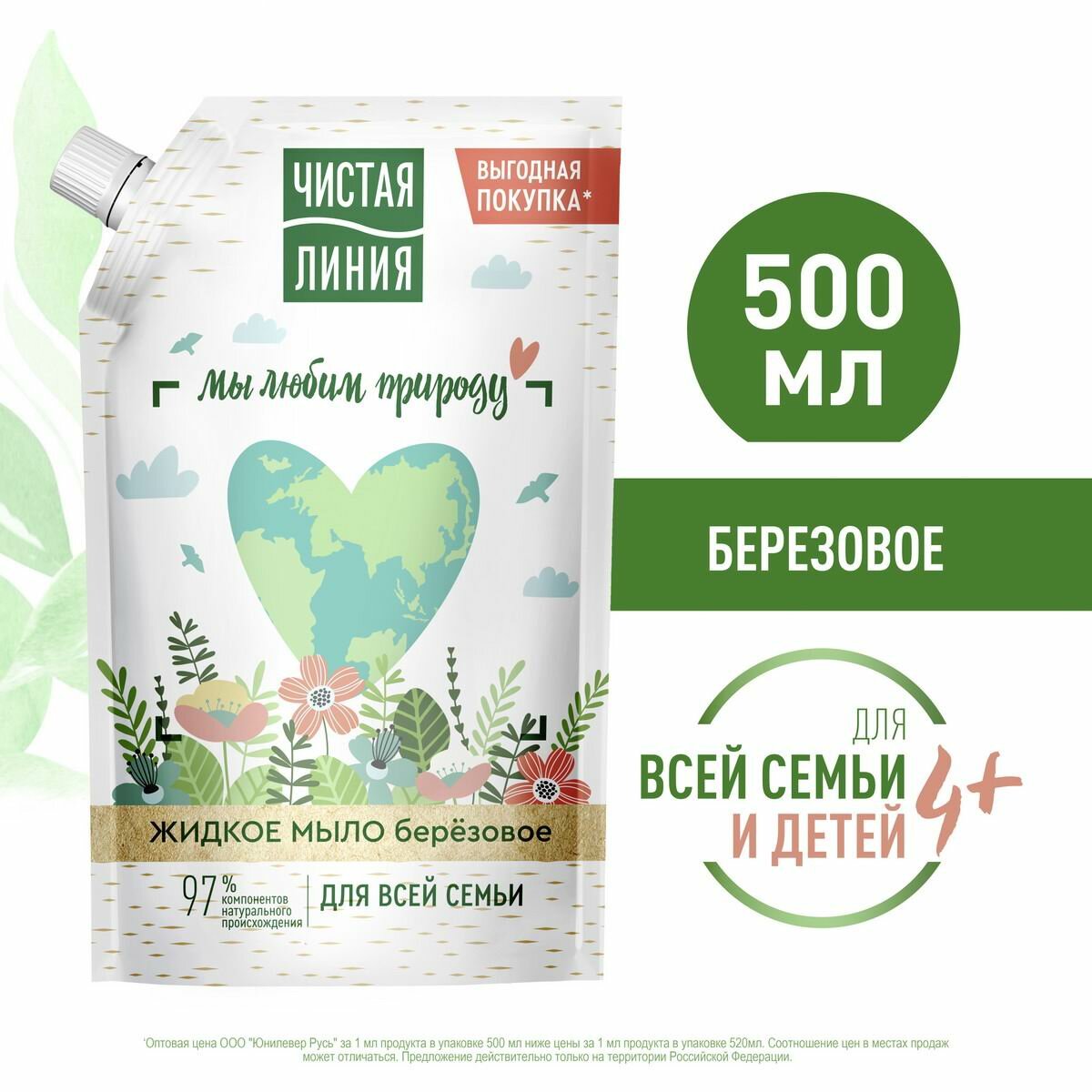 Жидкое мыло Чистая линия Для всей семьи Березовое обеспечивает бережный уход за кожей, смягчая и тонизируя ее. Натуральные компоненты мягко очищают, дарят гладкость и бархатистость. Подходит для детей от 3-х лет. Результат: кожа мягко очищена и увлажнена. Экологичная упаковка.До сих пор на нашей планете не было создано силы более сбалансированной, могущественной и вечной, чем сила природы. Поэтому мы изучаем полезные свойства растений и их впечатляющие способности к адаптации, исследуем благотворное действие их экстрактов, вытяжек и эссенций на кожу и волосы, чтобы усилить ими наши продукты.Ассортимент средств Чистая линия включает в себя множество косметических линий, которые обеспечивают комплексный уход за волосами, лицом и телом для поклонников бренда разных возрастов. Чистая Линия забота о красоте в нашей природе! Попробуйте также Чистая Линия Жидкое мыло Сила 5 трав 520 мл и Чистая Линия жидкое мыло Фитобаня 520 мл.Бренд Чистая Линия бережно относится к окружающей среде: мы заряжаем продукты природной пользой для вас, при этом предпринимая меры по сохранению нашей общей зеленой планеты для будущих поколений. Мы закупаем 100% возобновляемую электроэнергию, полученную с использованием энергии ветра, для производства продукции на наших фабриках в Екатеринбурге и Санкт-Петербурге, а также направляем 100% производственных отходов на утилизацию, отличную от передачи на полигон: на переработку или дальнейшее использование в других отраслях. Бренд Чистая Линия заботится о нашей природе.