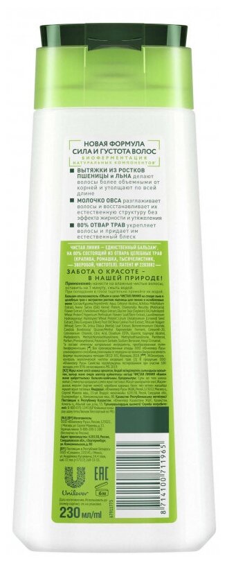 Новая формула бальзамов ЧИСТАЯ ЛИНИЯ создана для видимой СИЛЫ и ГУСТОТЫ волос. Технология биоферментации делает привычные натуральные компоненты до 60 раз эффективнее. Волосы становятся плотнее и гуще по всей длине. Бальзам ОБЪЕМ И СИЛА с экстрактом пшеницы и отваров льна интенсивно увлажняет и питает кожу головы. Активные натуральные компоненты средства ухаживают и восстанавливают волосы, образуют невидимый каркас вокруг каждого волоса, поддерживающий объем от корней без утяжеления. В масле пшеницы присутствуют микроэлементы цинк и селен, большое количество линолевой и других органических кислот. Потрясающий эффект лен оказывает на волосы, создает вокруг волоса невидимый каркас, поддерживает объем у корней без утяжеления Факт: при использовании шампуня совместно с бальзамом эффективность возрастает в 3 раза!