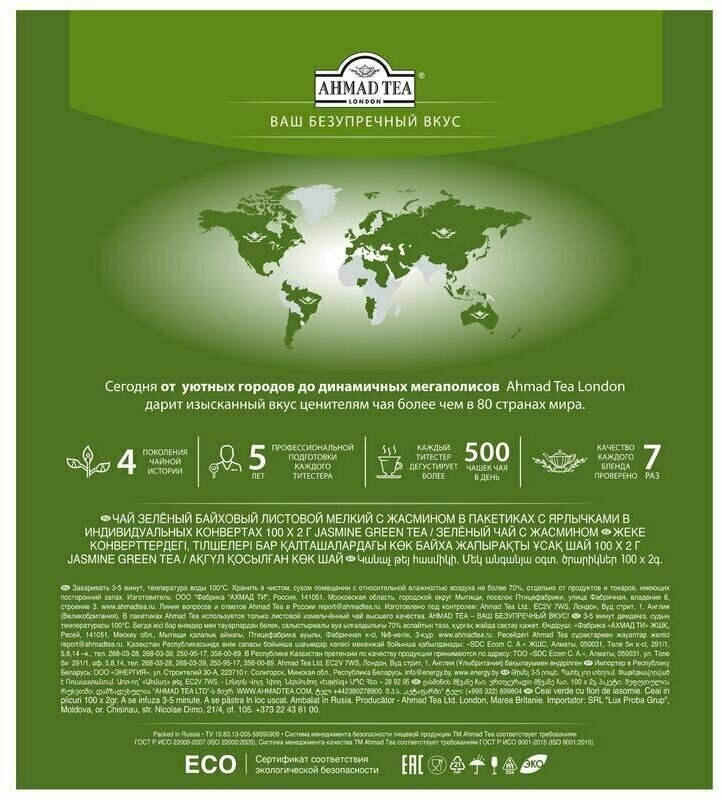 Деликатный купаж китайского длиннолистового чая с бутонами и цветами жасмина. При заваривании дает настой золотисто зеленого цвета со сладким вкусом и ароматом жасмина, и тонким ореховым послевкусием. В пакетиках Ahmad Tea используется только листовой измельченный чай высшего качества. Истинный ценитель чая знает, что в основе разнообразия вкусов от Ahmad Tea всегда лежит безупречное качество чая. Благодаря уникальной системе контроля качества, английская компания Ahmad Tea Ltd. обеспечивает постоянство безупречного качества и вкуса чая Ahmad Tea из года в год, в любой стране мира.